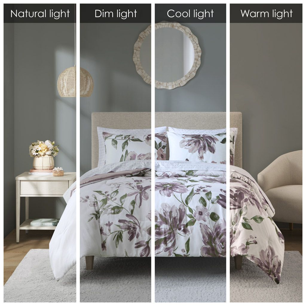 - Full bedding set includes floral print comforter, matching sheets, pillowcases, and shams.