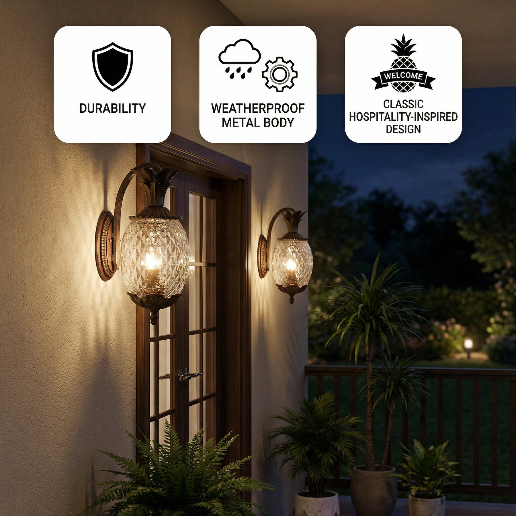 Buy Antique Bronze Pineapple Outdoor Wall Light – Charming Illumination & Classic Elegance to bring inviting beauty and traditional flair to your exterior. The reference product features a unique pineapple silhouette, symbolizing welcoming hospitality, with rich antique bronze detailing and a graceful hanging arm. Ideal for grand entrances, verandas, and stylish porches, it adds warmth, sophistication, and visual interest to any outdoor setting. Let the Antique Bronze Pineapple Outdoor Wall Light provide character-rich ambiance for dinners, gatherings, or nightly arrivals, combining charm and function in one exquisite statement piece. Add symmetry by mounting in pairs, or highlight architectural features with single fixtures—the possibilities are endless. Discover how the Antique Bronze Pineapple Outdoor Wall Light delivers more than just lighting—it brings lasting enjoyment and pride to your home.