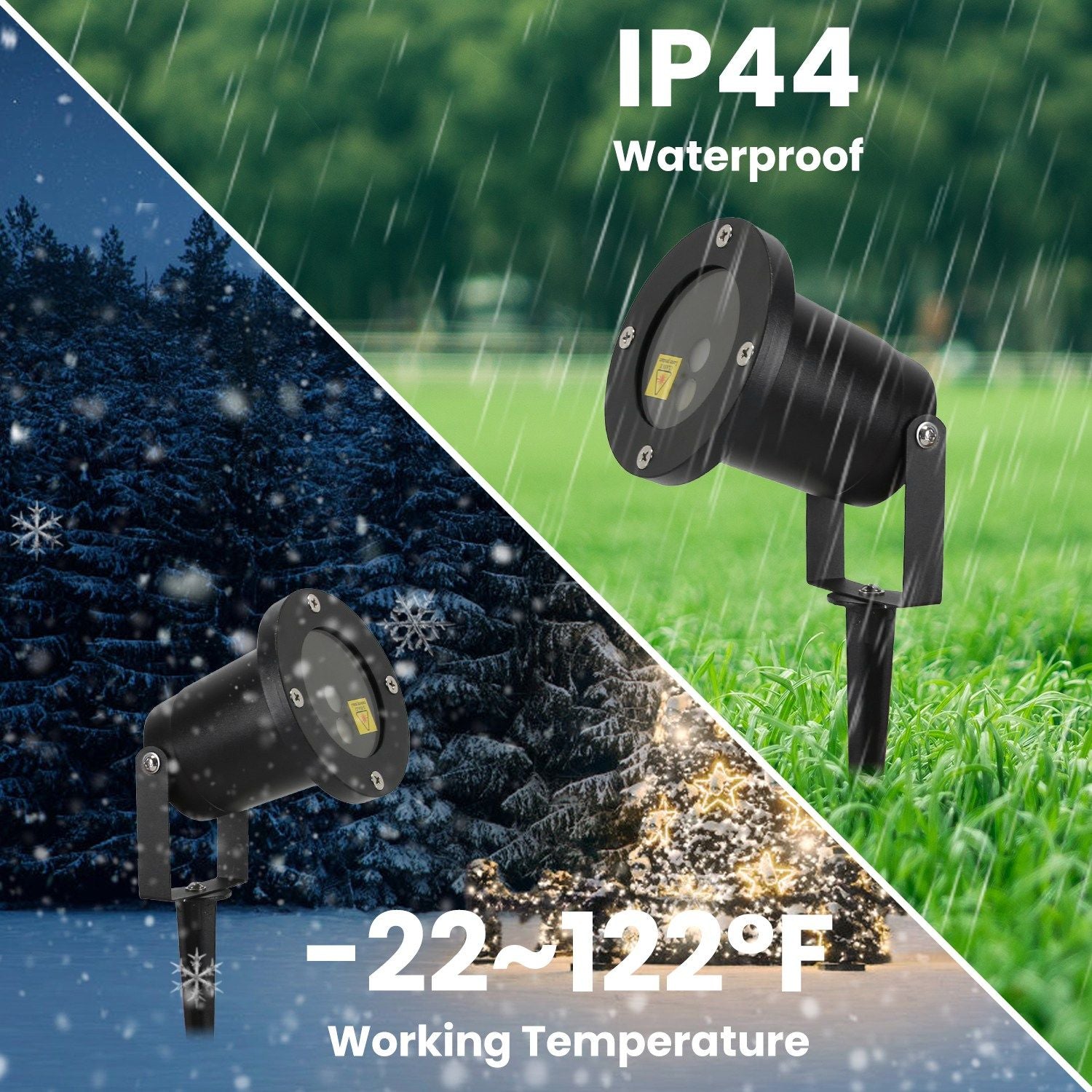 *IP44 Waterproof Laser Light*:Thanks to outstanding IP44 waterproof rating and sturdy iron body,this outdoor projector laser light can withstand -22℉~122℉ temperature,perfectly work in various harsh weather conditions,like rain,snow or heat. You can either simply use screw to fix it on bracket and mount this laser light on wall,or insert it onto ground by stake. 270° Adjustable angle helps you precisely control lighting direction.