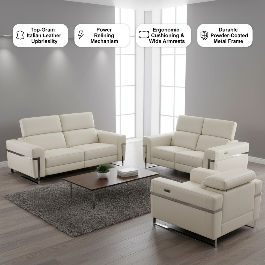 Step into a world of unparalleled seating comfort that is sure to dazzle even the toughest critic with our remarkable three piece indoor beige italian leather six person seating set. The reclining sofa will transform your space into a cozy haven for leisurely activities, movie nights, or even quick power naps. Upholstered in supple and luxurious genuine leather, this set has a rich and warm appeal. Coil spring seat construction provides excellent comfort by offering a responsive and supportive seating experience, gently contouring to the body's natural curves. The inclusion of a loveseat into your mix allows a fashionable seating option in a compact design. Chock full of value, this set has it all. 40-inch H x 82.4-inch W x 43-inch D