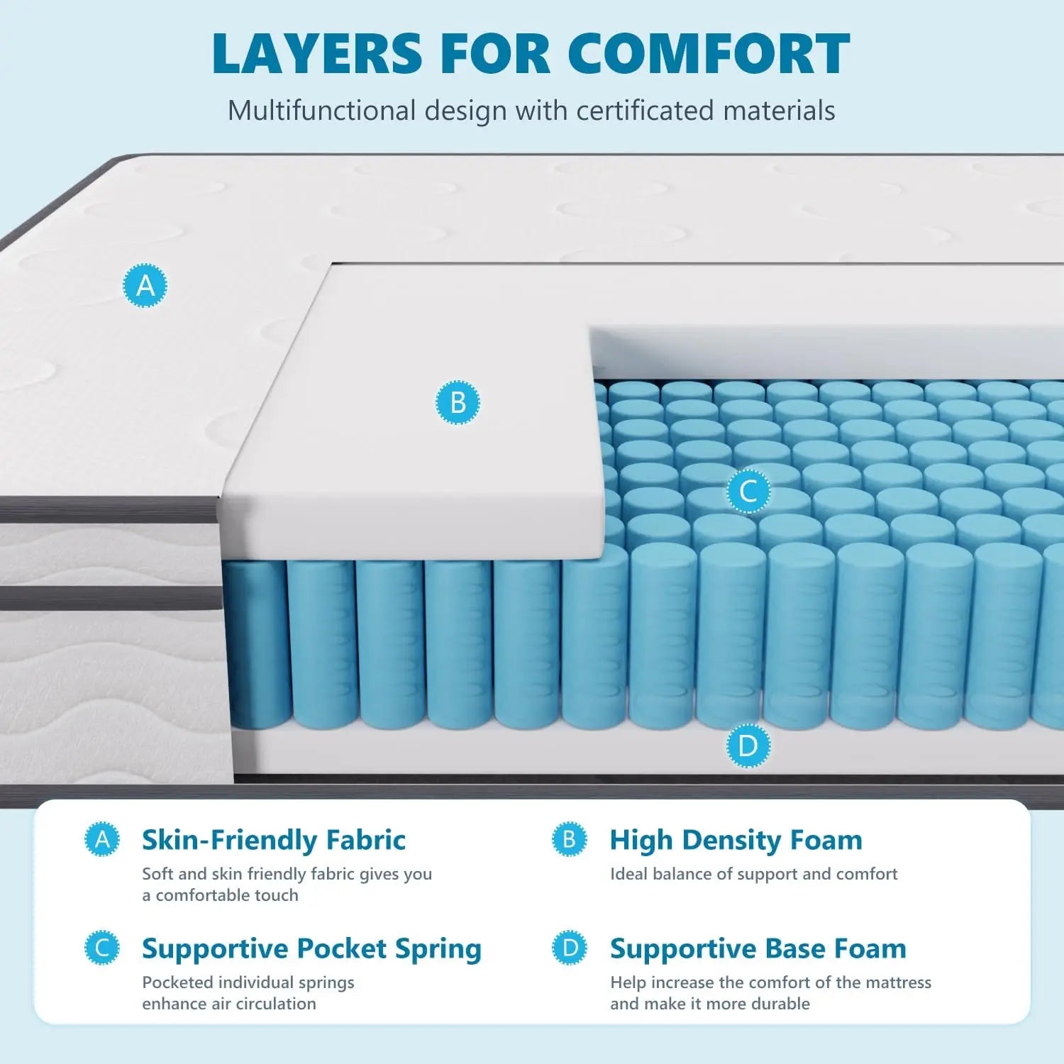 Quiet and Hassle-Free Sleep:The individual innerspring pocket coils in our mattress work independently, it tends to reduce noise and isolate motion when you move, effectively avoid movement interference between partners, and ensure your sleeping quality, makes you sleep through the night without disturbance