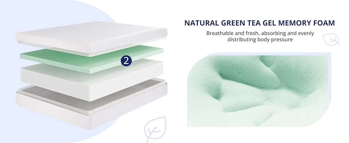 1. Comfortable Support - Pressure-relieving memory foam conforms to the shape of your body while enhancing circulation and decreasing stress on your joints. The all-natural green tea to help keep your mattress fresh for many nights to come.
