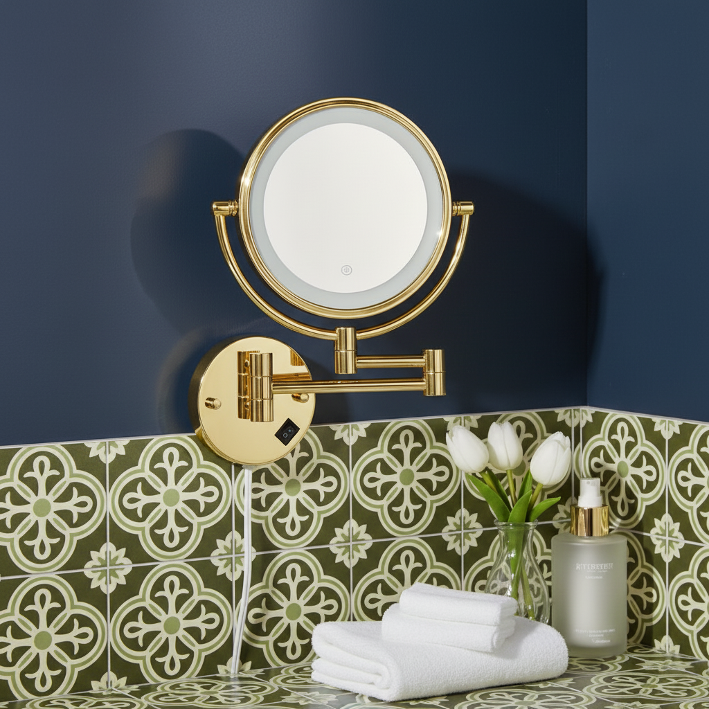 8 Inch LED Wall Mount Two-Sided Magnifying Makeup Vanity Mirror 12 Inch Extension Gold Finish 1X/3X Magnification Plug 360 Degree Rotation Waterproof Button Shaving Mirror