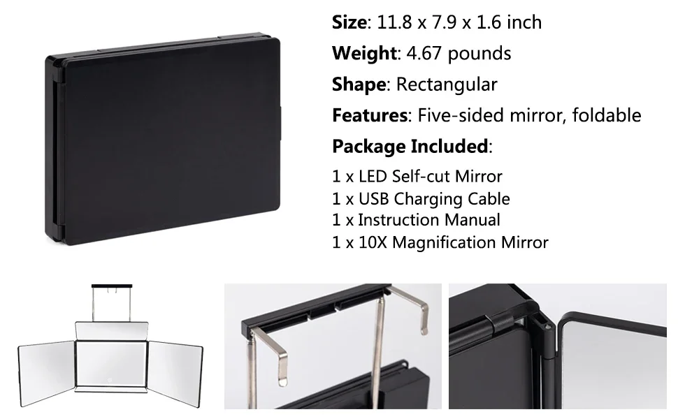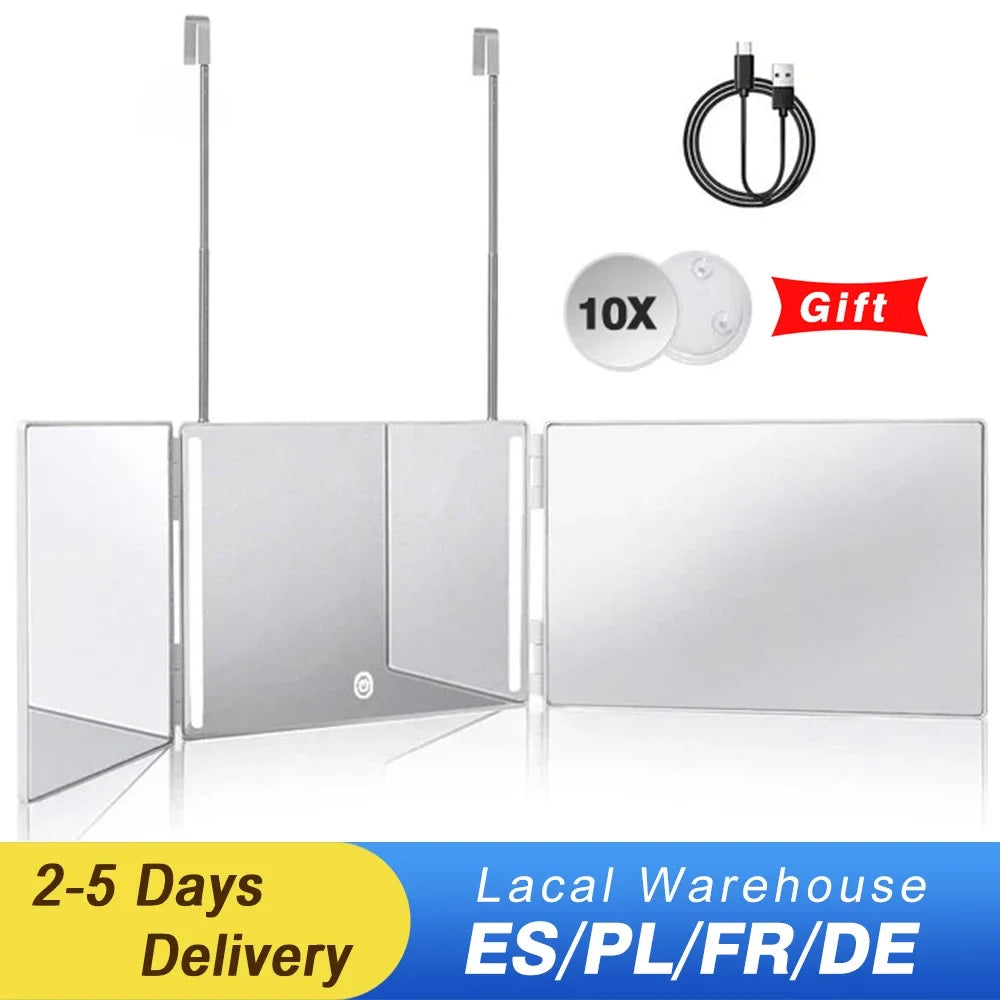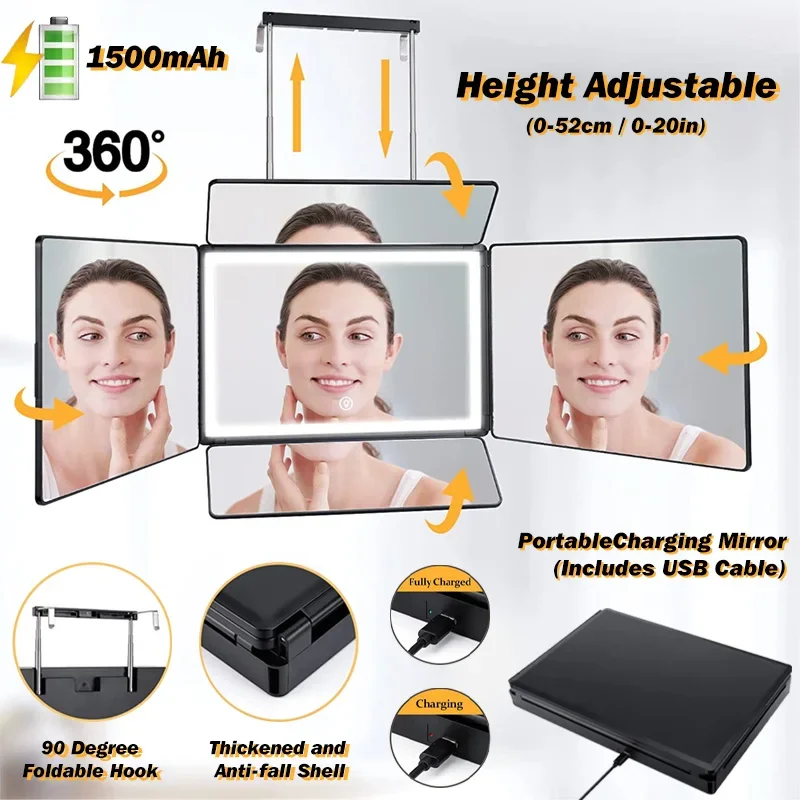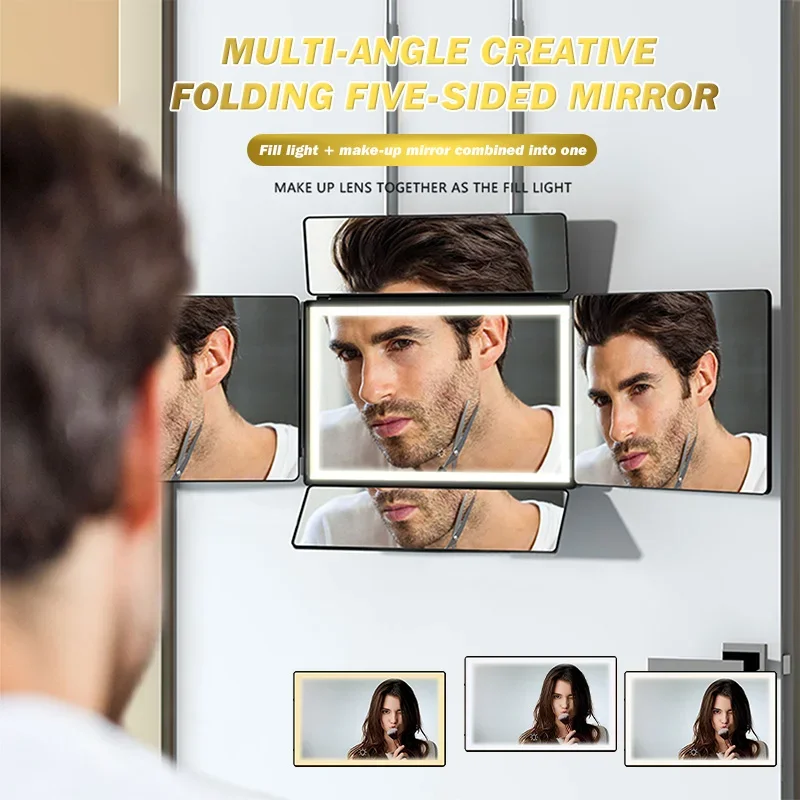 5 Way LED Light Vanity Mirror with Height Adjustable Self Hair Cutting 360° Mirror Rechargeable Five fold Self Haircut Mirror