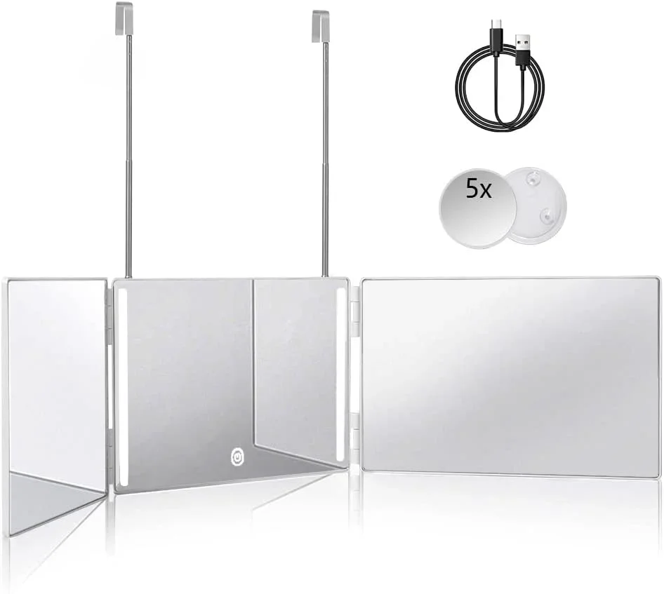 YINGHE 5 Way Mirror for Hair Cutting,Real Glass Adjustable Trifold Mirror with Light,Telescoping Hooks for Makeup and Styling