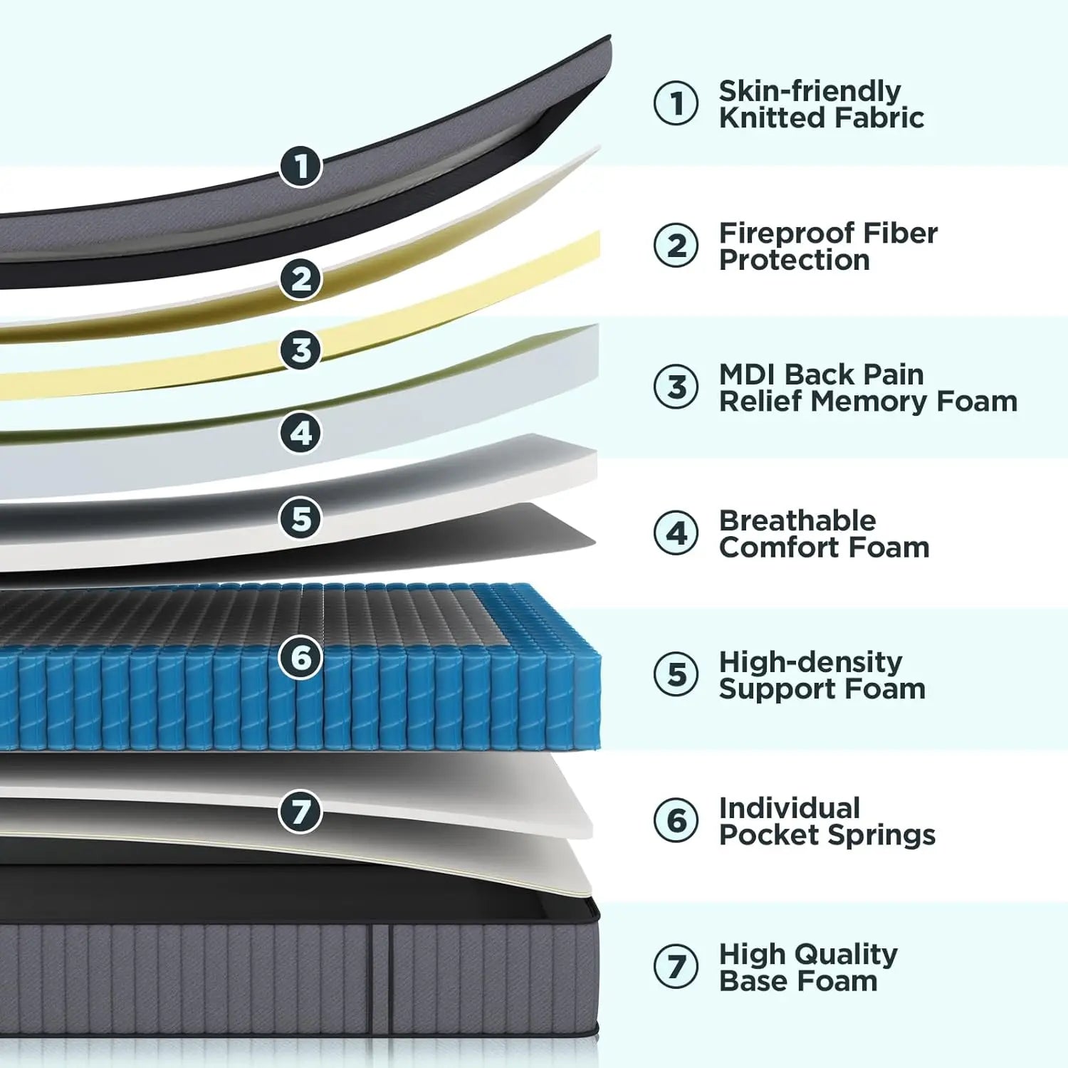PREMIUM MDI MEMORY FOAM: This 14inch queen size mattress combines the features of MDI memory foam, soft comfort foam, high-density foam, and individual pocket springs to align your spine and evenly distribute your body weight, effectively relieving pressure points during sleep. Make sure you relax while lying on the mattress without worrying about back pain. Sleepers can experience the pressure relief of the foam layers and the incredible feel of a pocket spring mattress.