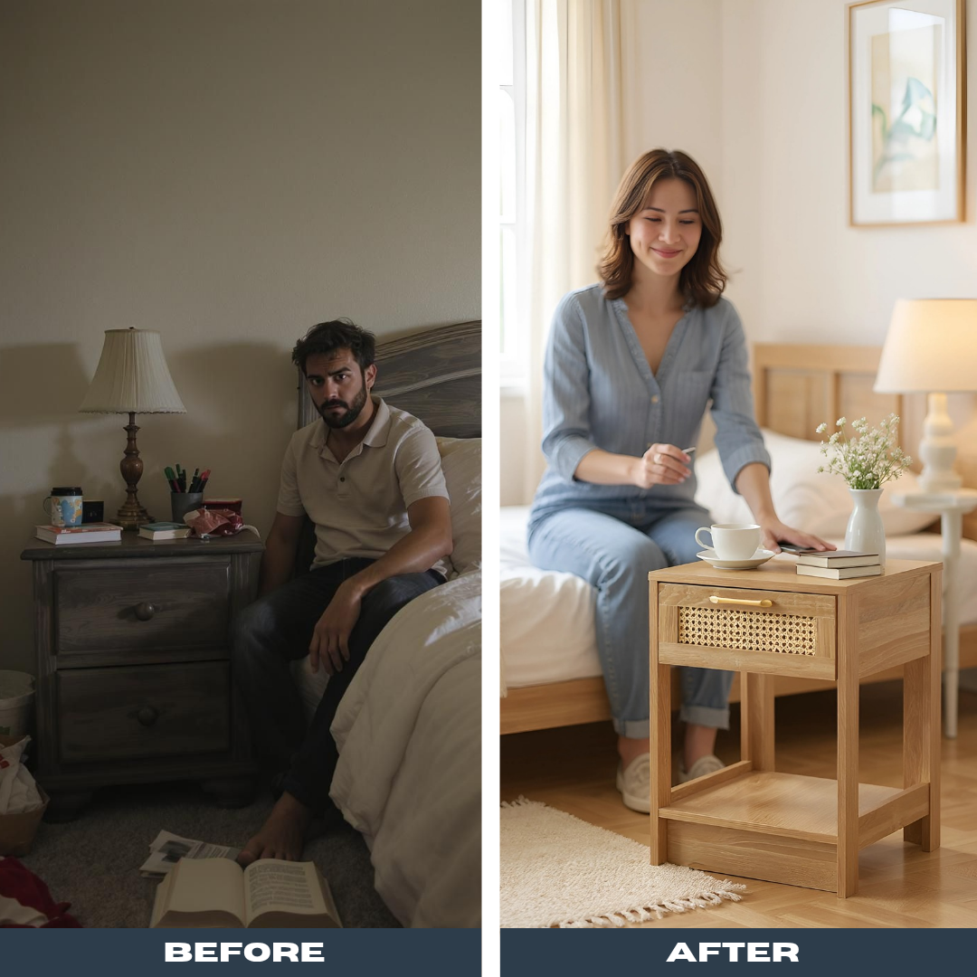 uy Contemporary Rattan End Table – Smart Storage Nightstand to bring effortless organization and artisan style into your home. Contemporary Rattan End Table – Smart Storage Nightstand combines modern function with natural beauty: a woven rattan drawer front provides a warm, textured accent, while the streamlined shape fits beside beds, sofas, or reading chairs. Thoughtfully equipped with a hidden drawer and power outlet, this table keeps devices charged and essentials out of sight, helping you create a restful, clutter-free sanctuary in any room.