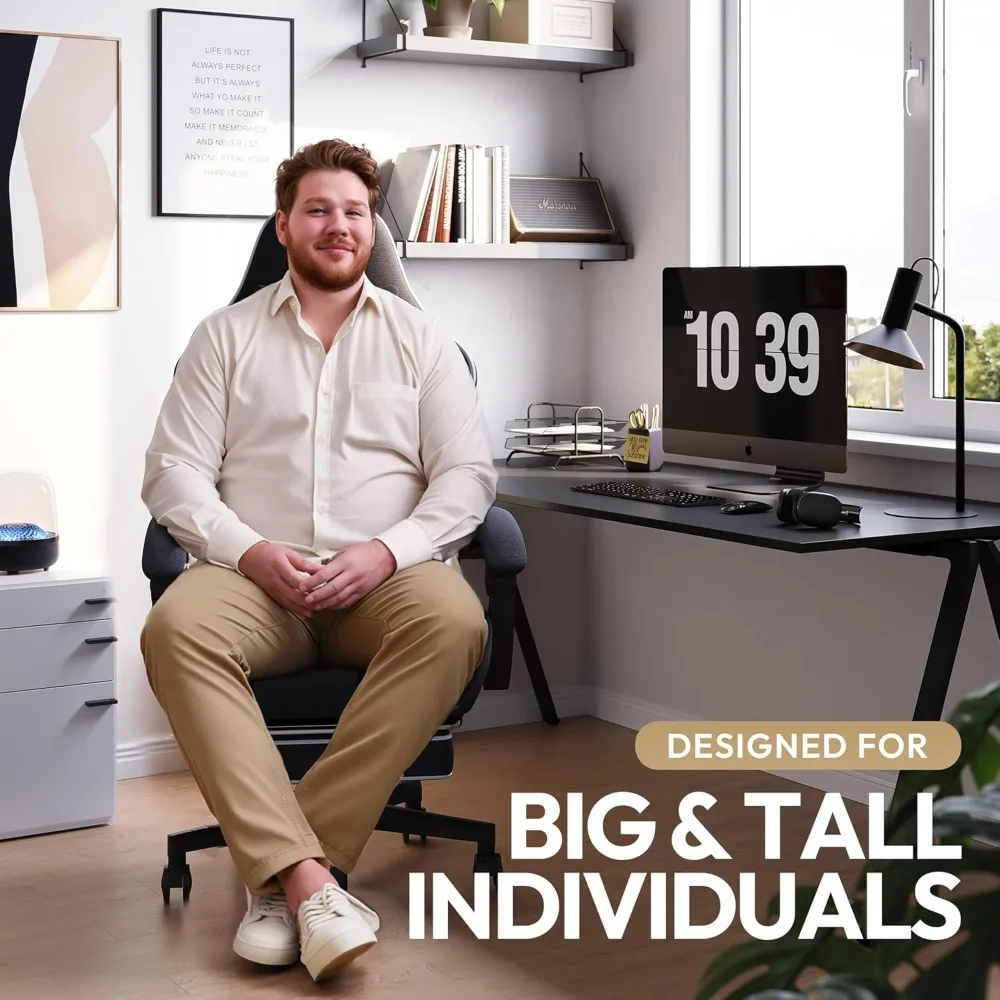 • Engineered for Big & Tall Physique: The perfect seated position starts with proper proportions – when your thighs are fully supported and knees align naturally at 90°. That's why we've redesigned this gaming throne with 1.6" taller backrest and 1.5" wider seat cushion versus our 6658 model. The elevated 26.97"-29.92" seat range ensures your feet plant firmly while the extended lumbar support properly cradles your spine. Pro tip: The reinforced steel frame maintains structural integrity even at maximum extension.