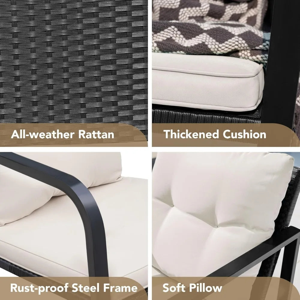 • 3 pieces patio bistro sets including 2 rocking chairs and 1 tempered glass coffee table. All weather resistant and UV resistant rattan with modern design patio sets complement any space and the durable construction, which is best for outdoor entertainment in summer or autumn.