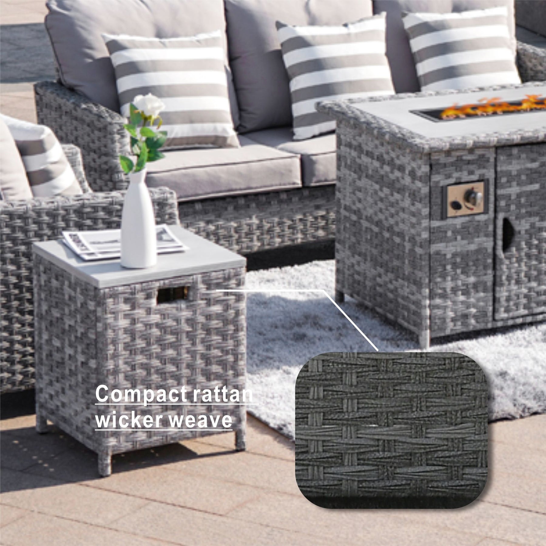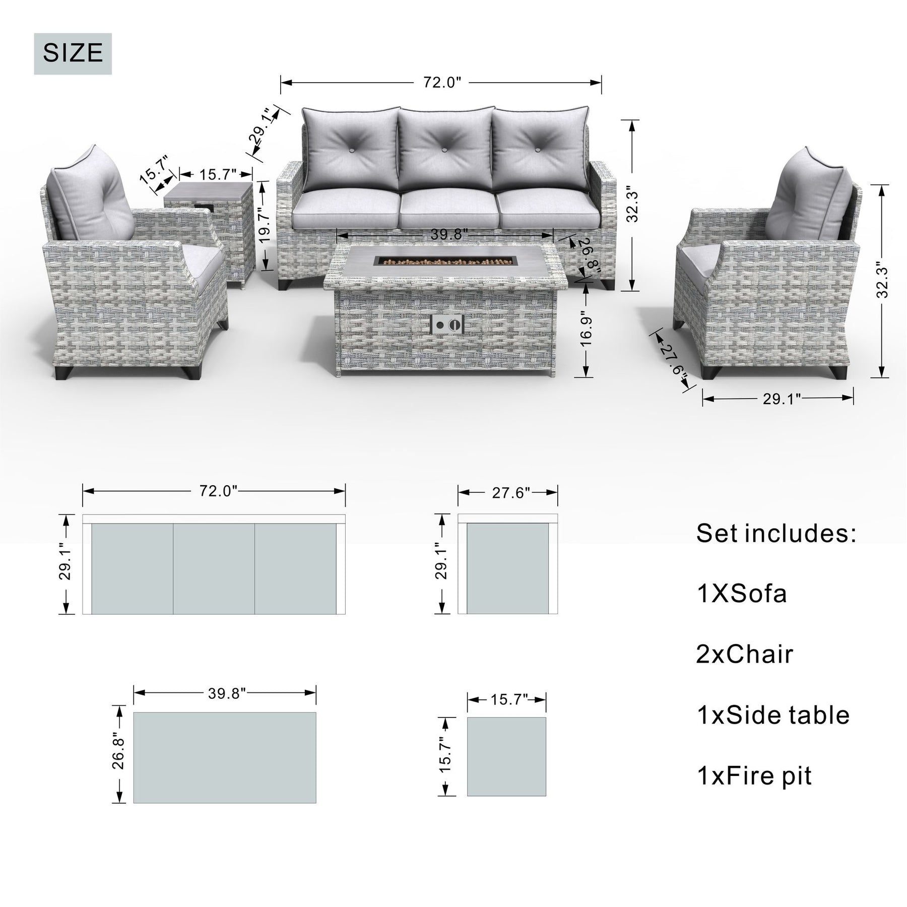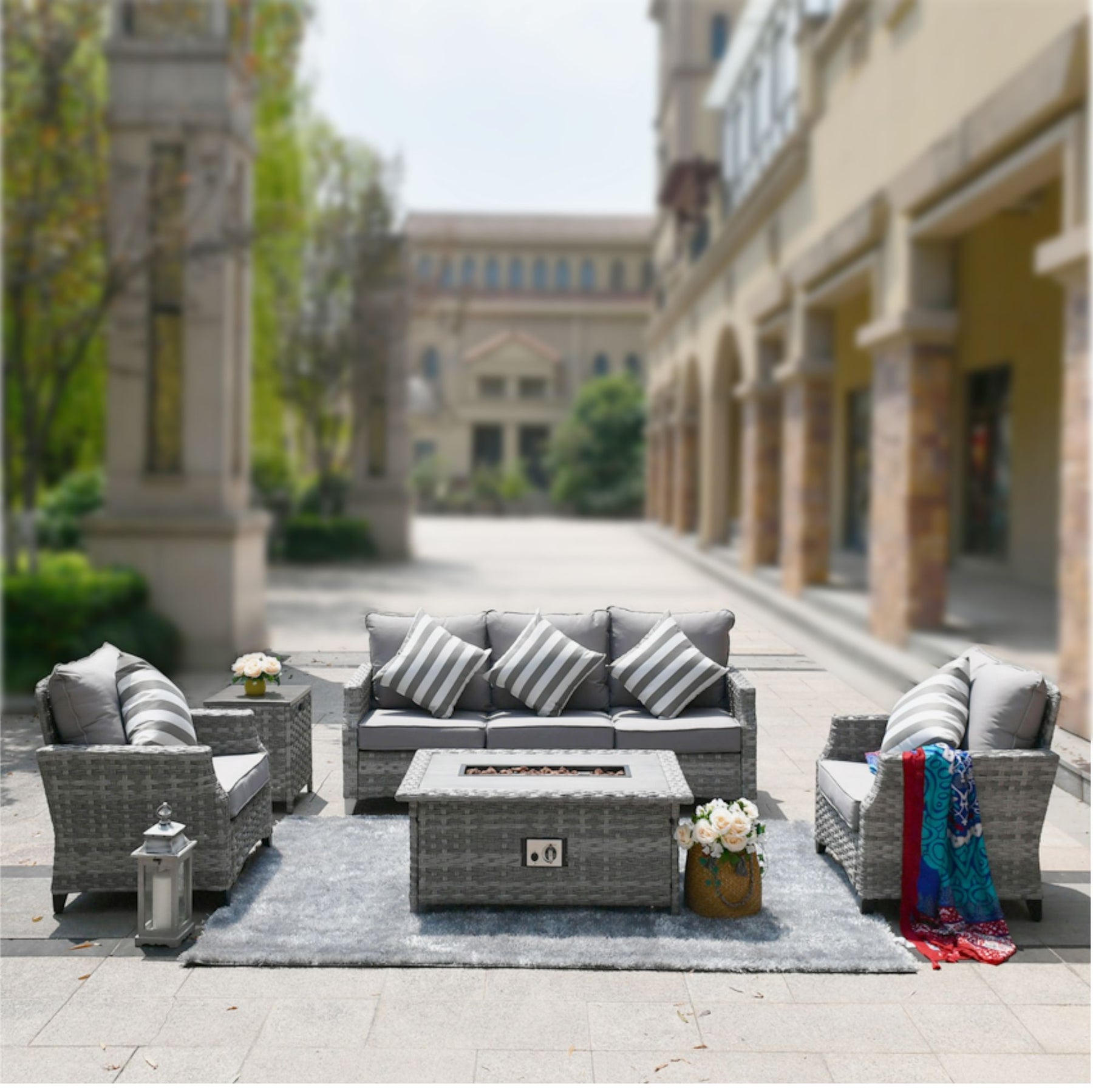 Buy the Contemporary Wicker Fire Pit Sectional – 5-Piece Patio Seating Set for an instant outdoor upgrade. This modern sectional ensemble includes a three-seat sofa, two single armchairs, a side table, and a state-of-the-art gas fire pit table, all wrapped in durable PE wicker with plush gray cushions. The Contemporary Wicker Fire Pit Sectional – 5-Piece Patio Seating Set transforms any patio or deck into a resort-style retreat, delivering comfort, warmth, and style for every gathering. Choose Trufairs for premium outdoor collections—reliable delivery and exceptional value for memorable moments under the sky.