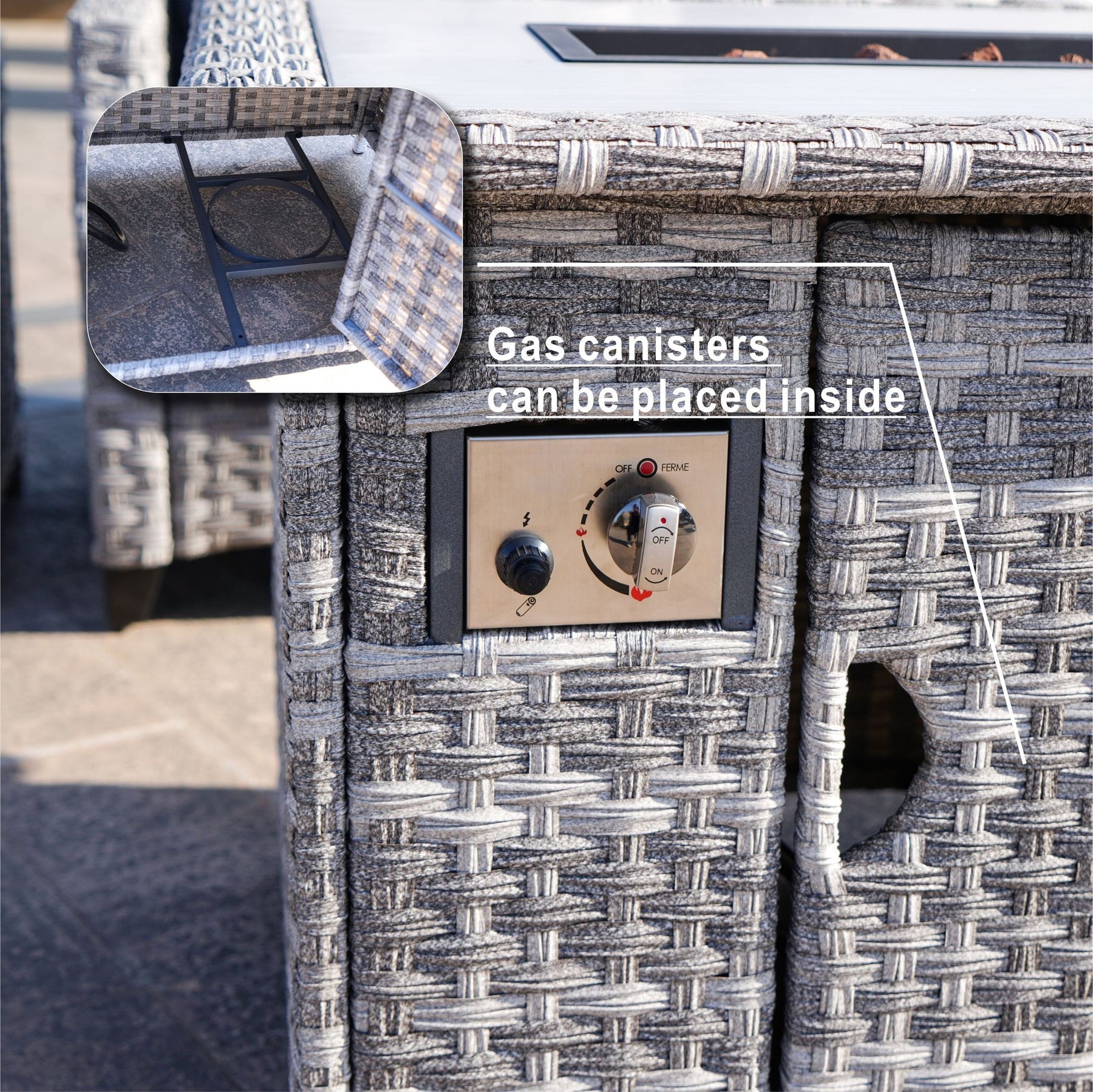 - - Finish: Weather-resistant handwoven PE wicker, aluminum top fire pit