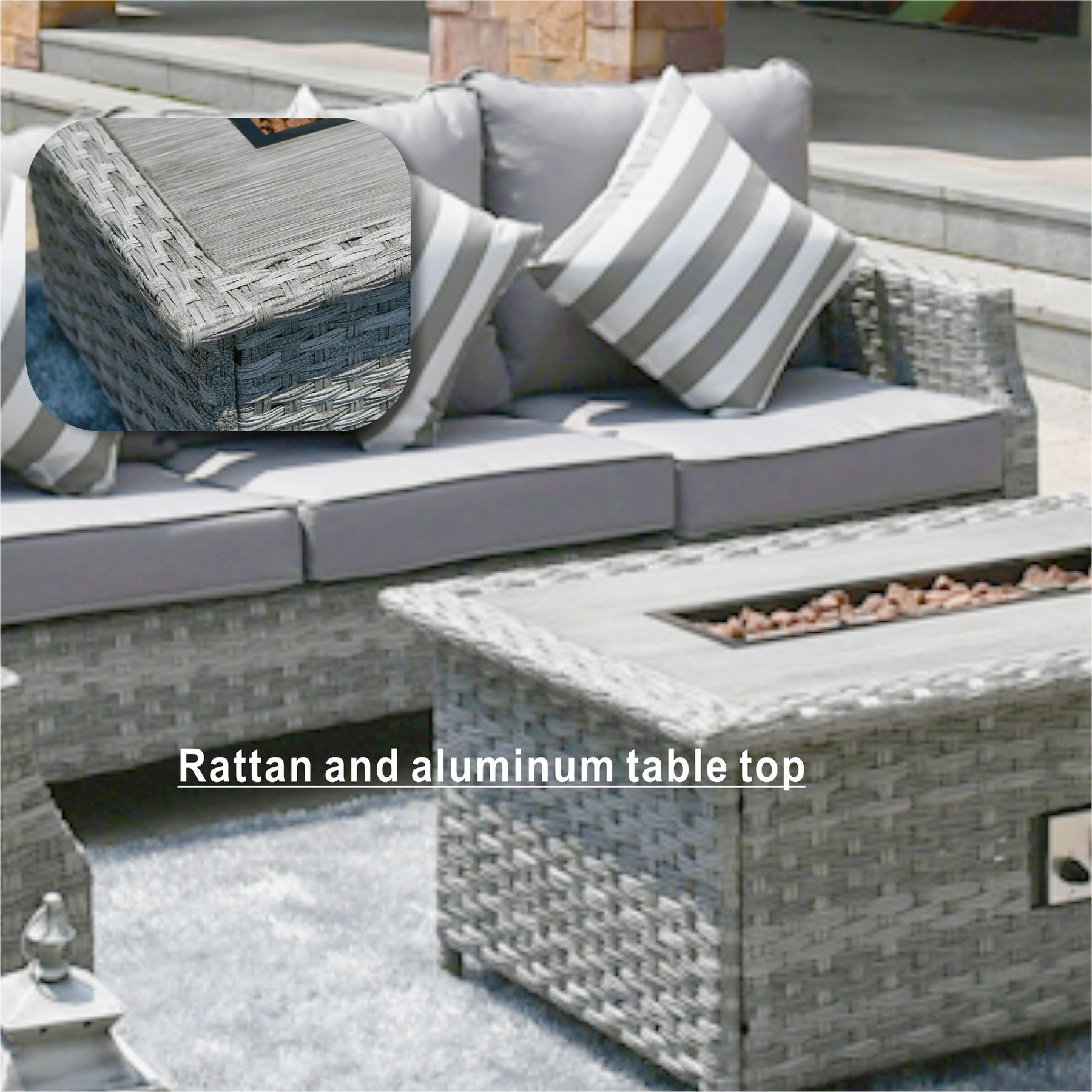 Contemporary Wicker Fire Pit Sectional – 5-Piece Patio Seating Set | Gray Cushions | Trufairs