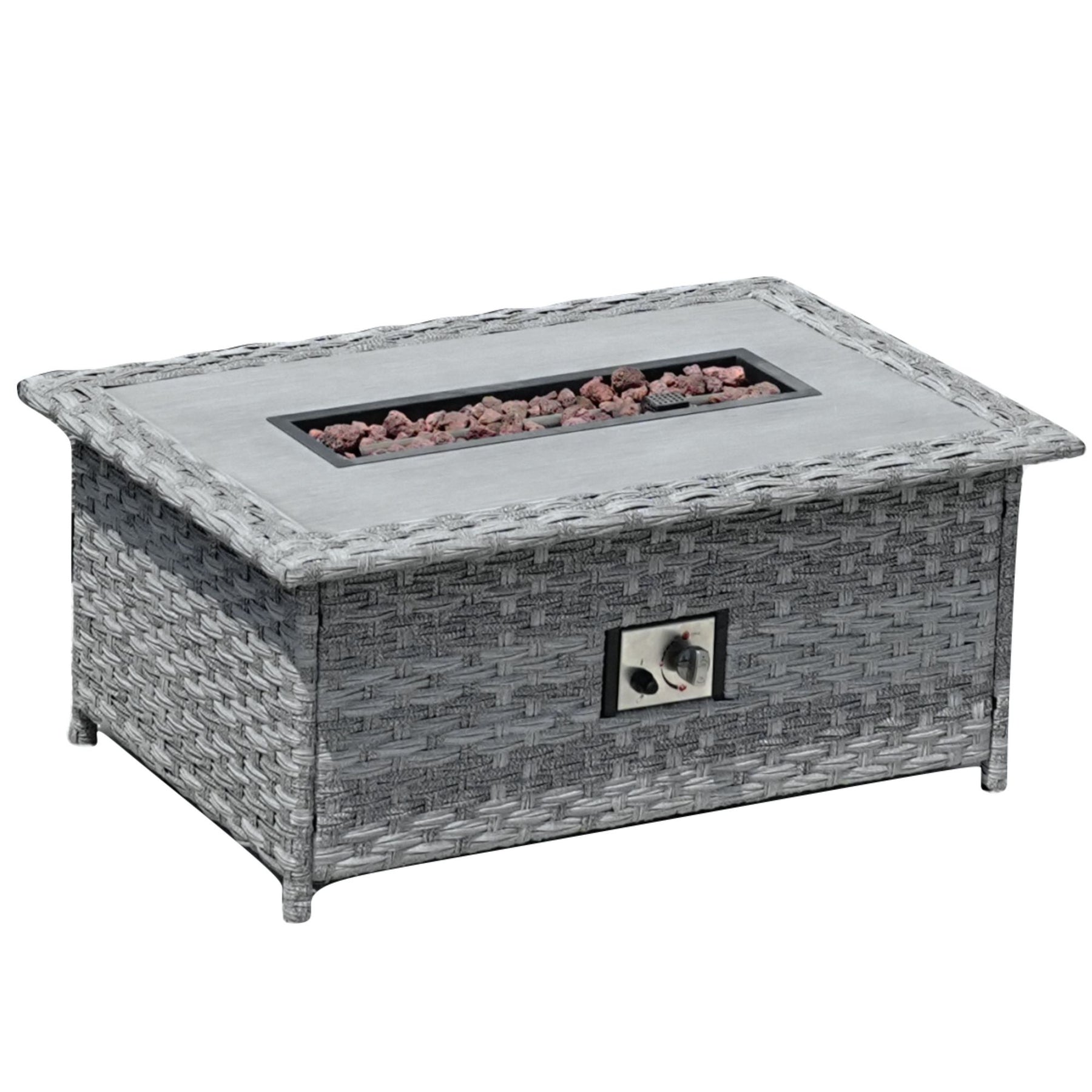- CSA-certified gas fire pit with aluminum inlaid top and lava rocks.