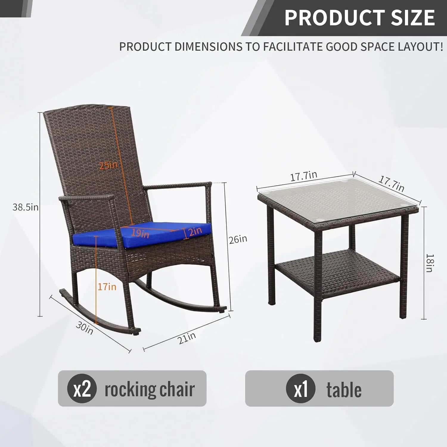 Outdoor PE Wicker Rocking Chair 3-Piece Patio Rattan Bistro Set 2 Rocker Armchair and Glass Coffee Side Table Furniture Washable Lacing Cushions, Blue