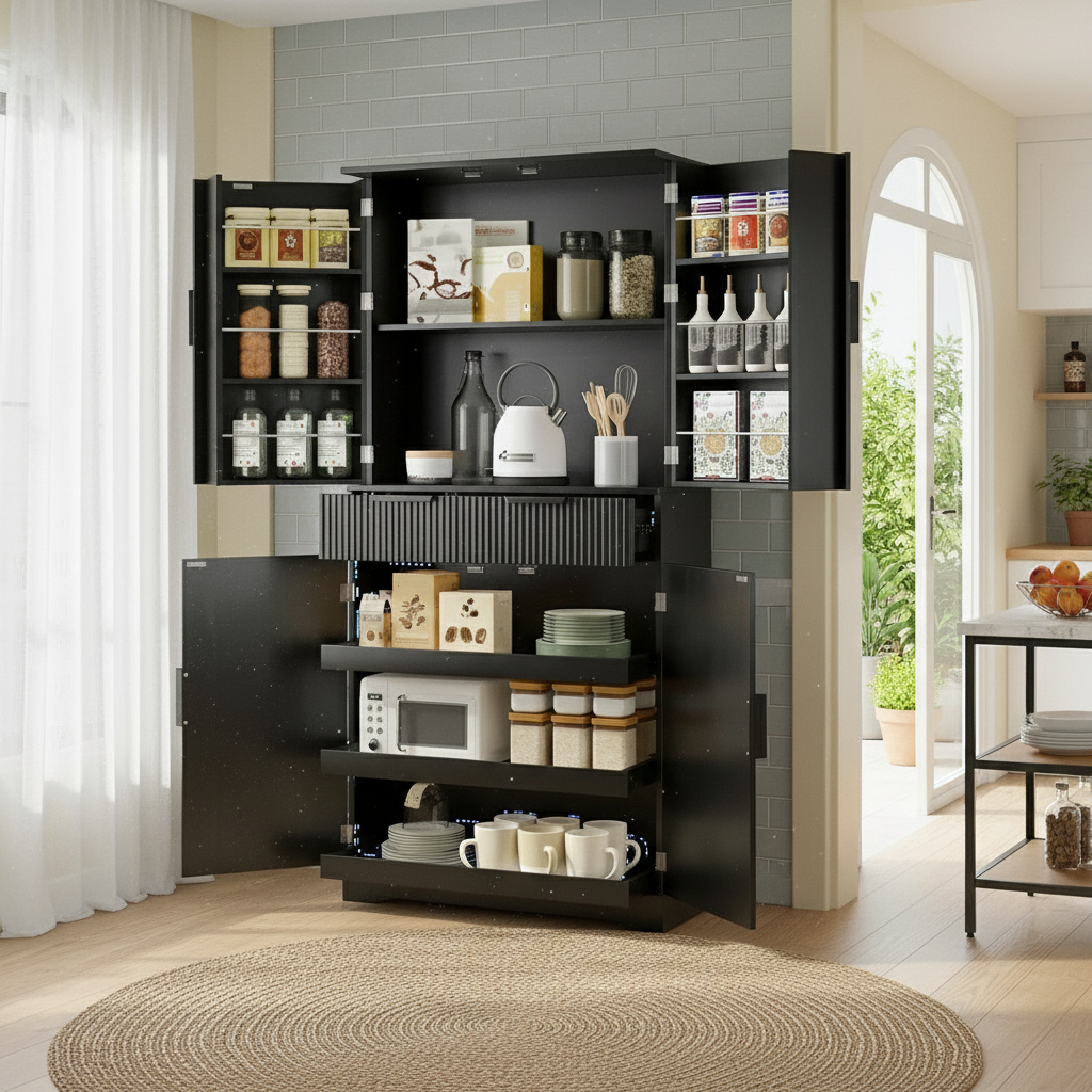 Moisture-Proof & Heavy-Duty: Crafted from premium materials with a smooth, easy-to-clean surface, this large pantry cabinet is built to last. The sturdy construction ensures durability, while the elegant metal handles add a touch of sophistication.