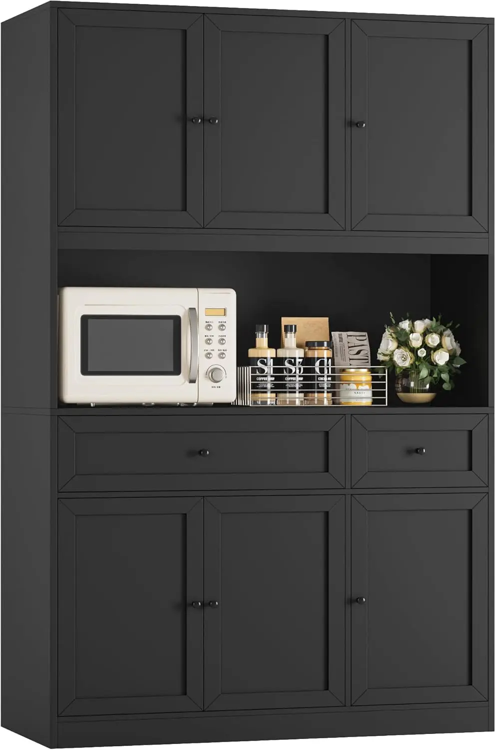 72" Kitchen Pantry Cabinet, Kitchen Hutch with Microwave Stand, Buffet Cabinet with Hutch for Dining Room, Black