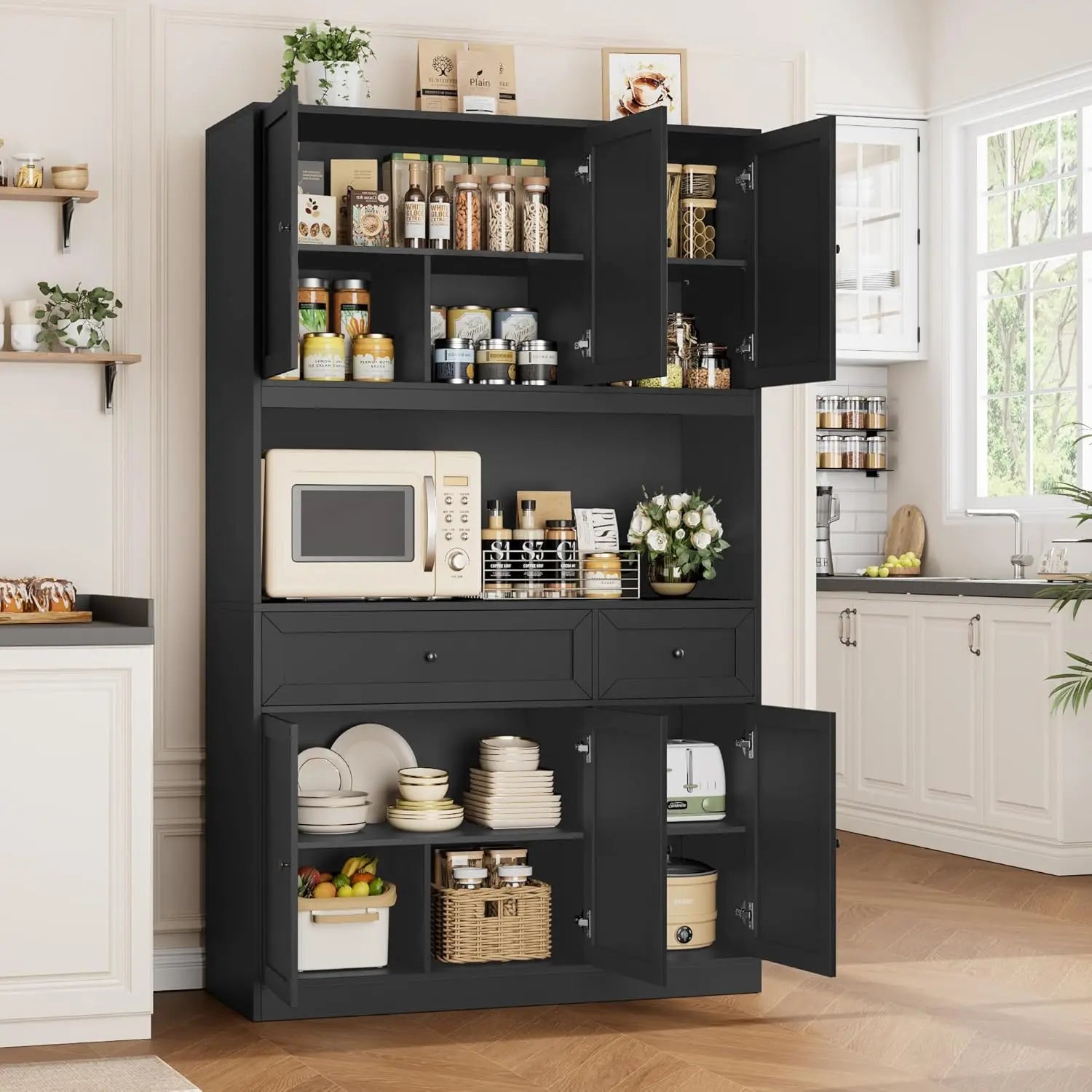 • Large Kitchen Cabinet: This 72-inch kitchen pantry storage cabinet features 10 enclosed compartments of various sizes. Whether for spices, baking ingredients, or cookware, it provides dedicated storage space. Paired with two wooden drawers, it easily organizes knives, forks, and utensils, hiding clutter and helping to free up space
