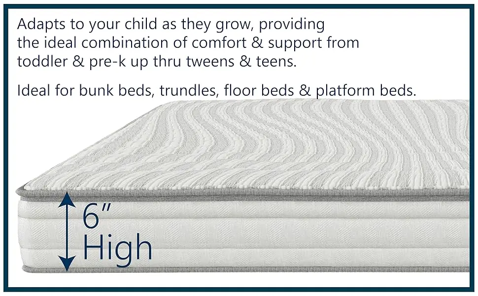 1. THE SLIM 6-INCH profile makes this mattress an ideal choice for your child's floor bed, bunk bed, trundle or platform bed.