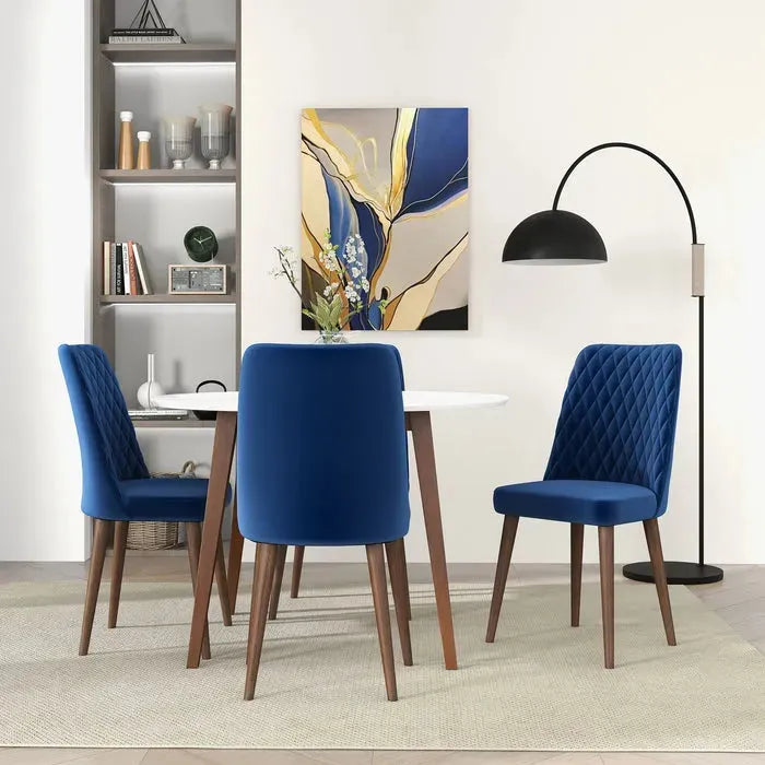 Achieve timeless elegance in your dining room with the Katie Navy Blue Velvet Dining Chair (Set of 2). These incredible navy blue velvet chairs are full of style and sophistication, making them the perfect complement to any contemporary or traditional interior. Vibrant colors are perfect for any dining space and the soft velvet texture gives it a luxurious feel. The deep navy blue hue comes together to make a calming yet bold statement that will naturally build and brighten your homes overall feel while remaining adaptable enough to fit your decor theme. Their minimalist silhouette and clean lines create a sophisticated look that goes with many different dining tables: sleek glass, rustic wood, industrial metal and some, yes. Not only do the Dining Chair look incredible, but they are also built to last with stability to spare — an investment in style and quality for years to come.