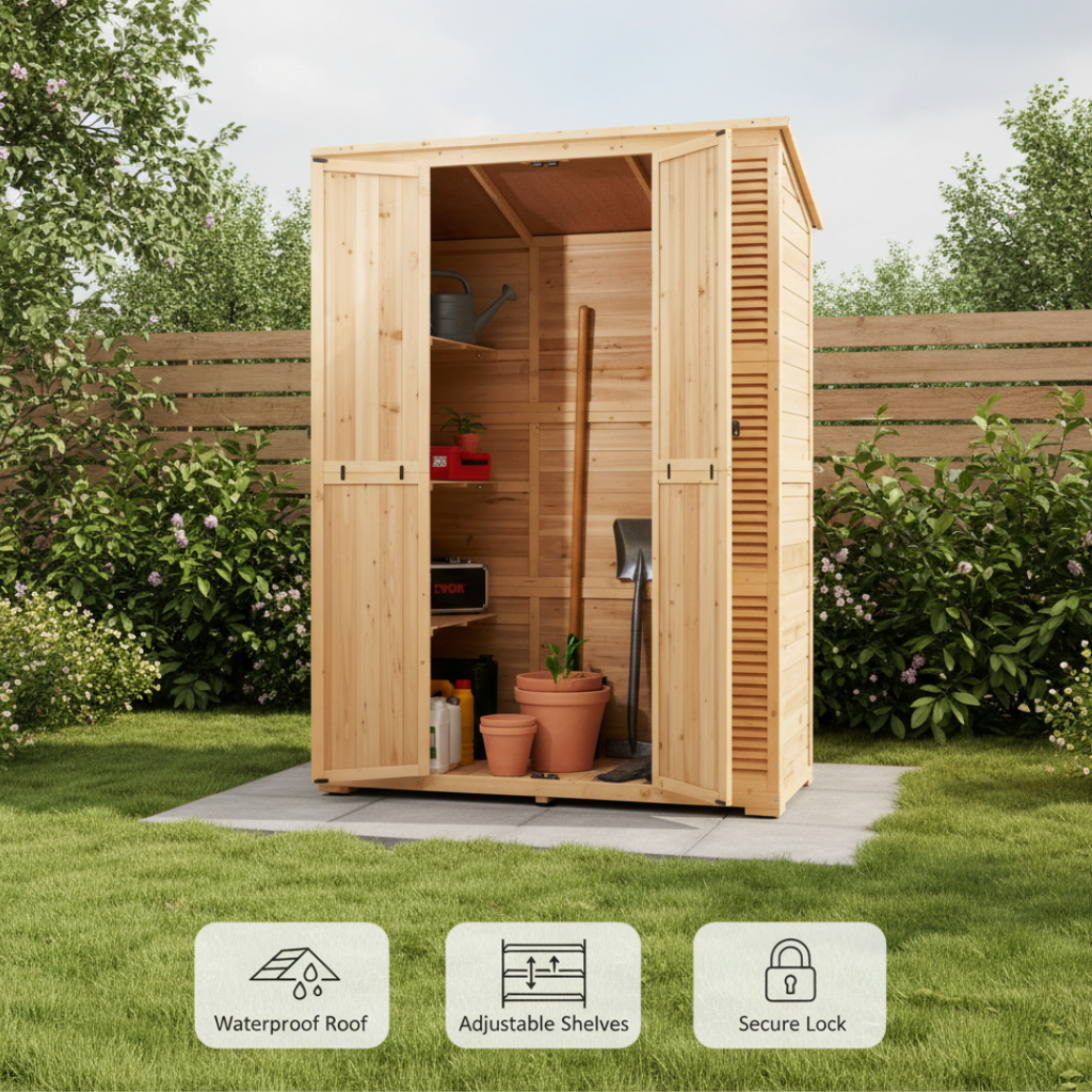 1.Sturdy Structure: This outdoor storage shed is made from high-quality natural cedar wood and treated for excellent waterproofing and corrosion resistance. The thoughtful anti-tip design effectively prevents the cabinet from tipping over, ensuring it can withstand various climate conditions for long-term use.