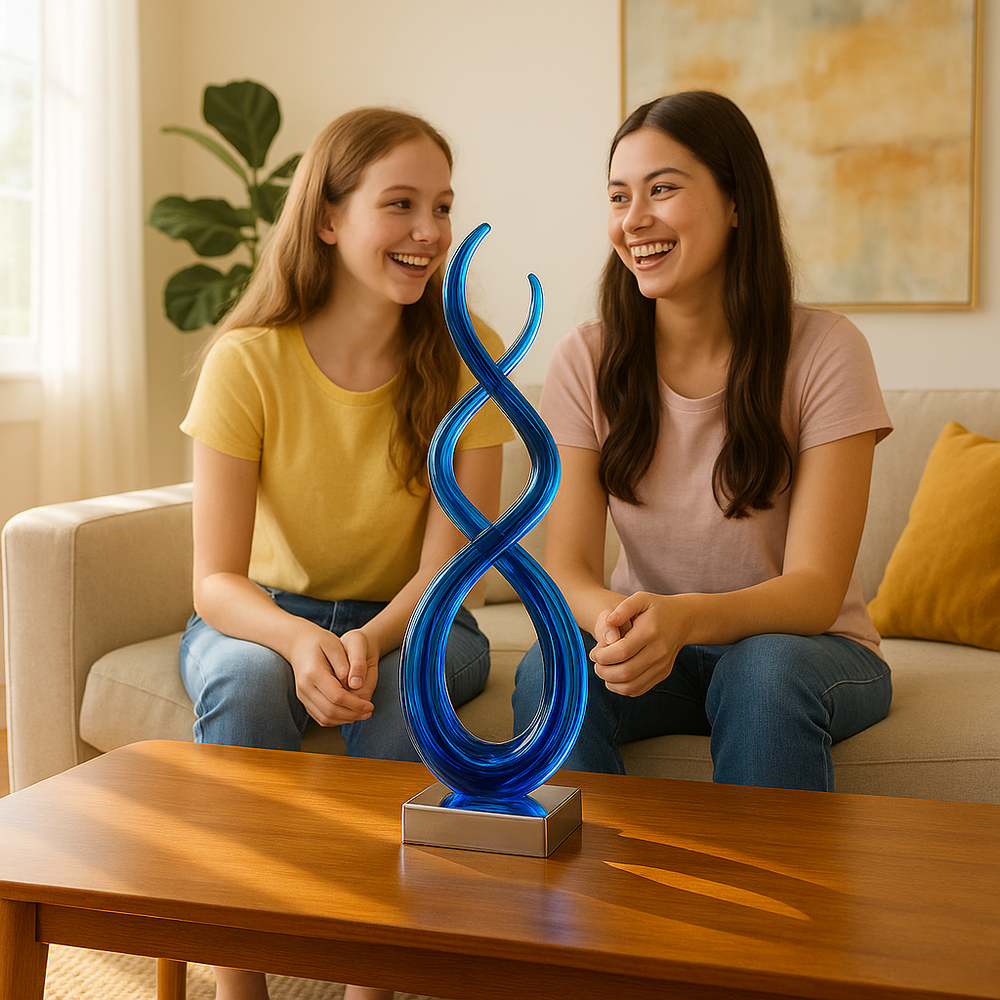 Transform your living space with this stunning 11" Clear and Blue Murano Glass Modern Abstract Tabletop Sculpture, a perfect decorative accessory that brings contemporary elegance and artistic sophistication to any environment. This expertly handcrafted sculpture is made from high-quality Murano style art glass in beautiful clear and blue hues that create a captivating visual display. The 11" Clear and Blue Murano Glass Modern Abstract Tabletop Sculpture represents the perfect fusion of traditional glassmaking techniques and modern abstract design, making it an ideal centerpiece for living rooms, dining areas, or office spaces. Crafted by skilled artisans using all-natural, environmentally sustainable materials, this piece ensures that no two sculptures are exactly alike, making each one truly unique. The contemporary styling and abstract form create visual interest while the translucent glass properties allow light to play beautifully through the piece, adding dimension and sparkle to your décor. Due to the genuine nature of the materials and expert craftsmanship, slight variations or bubbles may appear, adding to the authentic artisanal character.