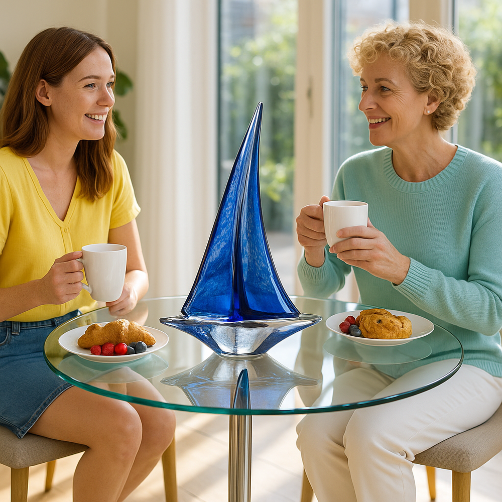 Elevate your home décor with the sophisticated 9" Clear and Blue Murano Glass Modern Abstract Tabletop Sculpture, designed to serve as both a conversation starter and a meaningful decorative element. This high-quality sculpture makes an exceptional gift idea for various occasions including bridal showers, engagements, housewarmings, Mother's Day, Christmas, birthdays, and more. The 9" Clear and Blue Murano Glass Modern Abstract Tabletop Sculpture's compact yet impressive presence allows it to serve as a striking focal point on mantels, console tables, or shelves while maintaining sophisticated appeal. Expertly handcrafted by skilled artisans using machine-made construction techniques, this piece ensures consistent quality while preserving the artistic integrity of traditional Murano glass methods. The transportation-themed sailboat design offers timeless appeal that complements both modern and traditional interior design styles. This versatile piece works beautifully on its own as a statement piece or can be mixed with other decorations to create the perfect aesthetic for your space.