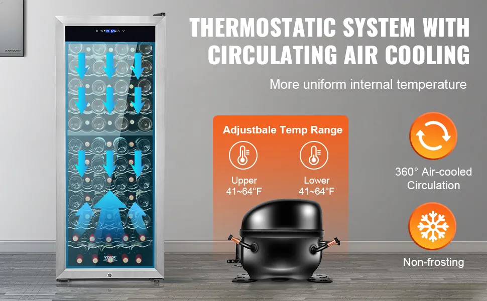 - Dual-Zone Temperature Control: Dual-zone cooling with independent temperature controls. The upper zone ranges from 41°F to 64°F, and the lower zone also ranges from 41°F to 64°F, allowing you to adjust settings according to your needs for optimal wine storage.