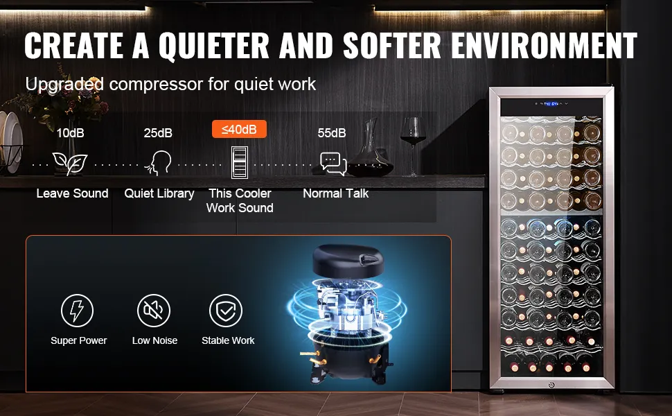 - Silent Operation: Featuring an advanced compressor that delivers rapid, powerful, and stable cooling with precise humidity control, ensuring your beverages remain in perfect condition. Low-vibration operation keeps noise levels below 40 decibels, creating a quiet environment.