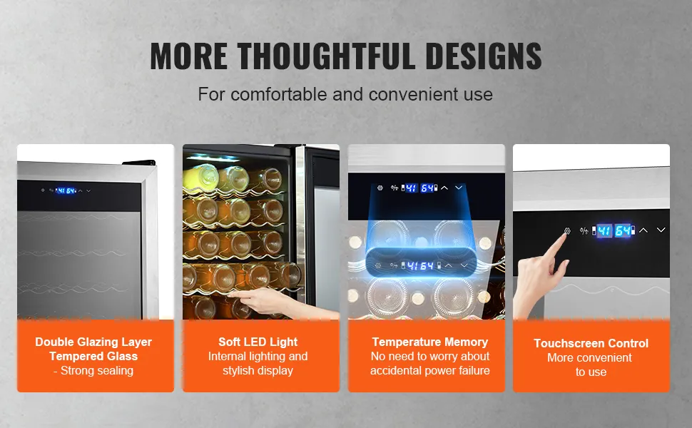 - Thoughtful Details: The double-layered mirrored glass door not only insulates the interior but also protects your collection from harmful UV rays. Adjustable wood shelves are easily removable; soft LED lighting illuminates the interior for easy access to your collection. Temperature memory function resumes the original settings after a power outage. Touchscreen controls make operation convenient, and the front ventilation ensures effective heat dissipation.