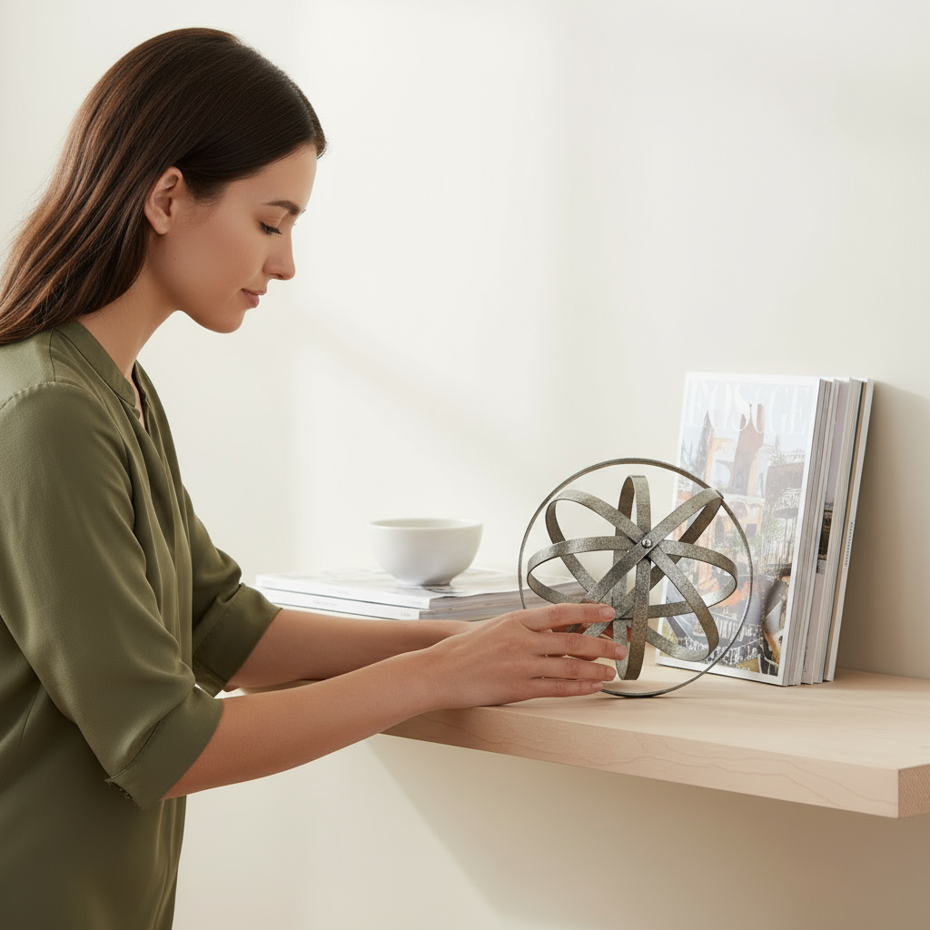 Add a touch of contemporary design to any space in your home with this Speckled Gray Metal Orb decorative tabletop sculpture. This handcrafted piece is made from metal and has distressed gray/silver color. The orb shape features an outer circle inside of which there are oval shapes that intersect and create an open geometric shape. 7.5-inch H x 7.5-inch W x 7.5-inch D