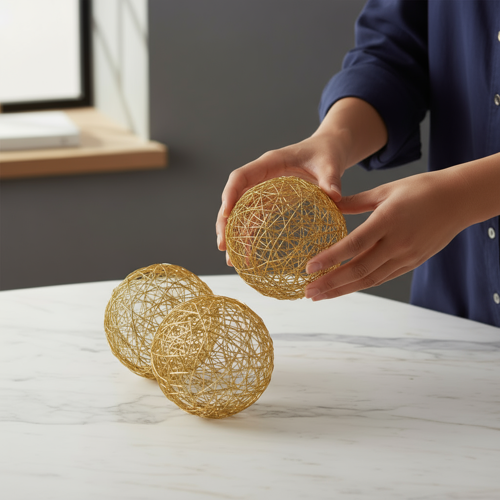 Elevate your space with this stylish set of three gold wire decorative orbs. Crafted from high-grade iron in a gold finish, the open and airy wire sphere resembles a ball of twine. The modern design adds a touch of fashion to any room, making it a perfect decorative addition for those who appreciate geometric shapes and contemporary design. This set of three can be displayed together or separately and is sure to add some unique and modern vibes to your space. 3-inch H x 3-inch W x 3-inch D