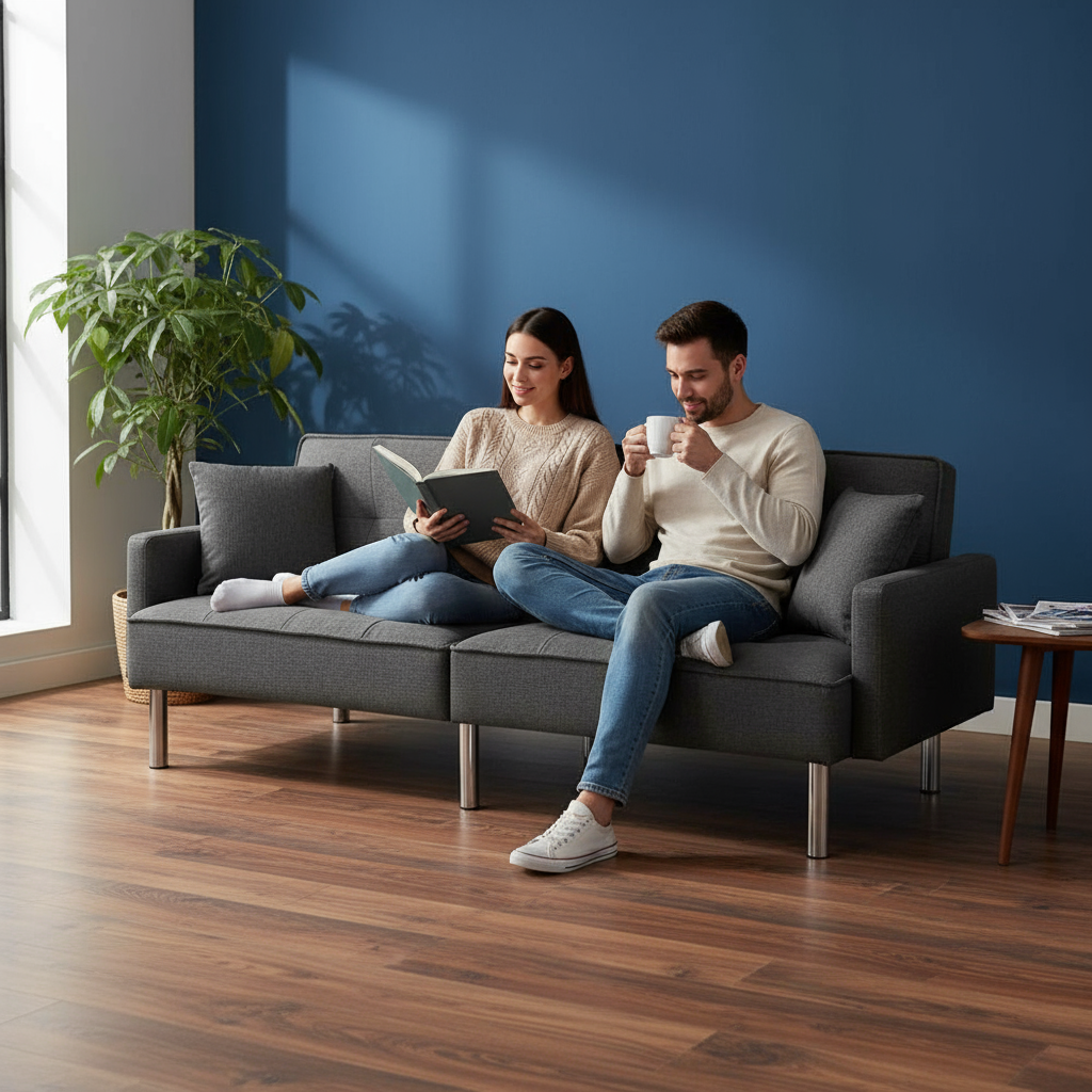 Included are two matching toss pillows, which not only enhance the sofa’s visual appeal but also deliver added comfort for lounging. The construction is thoughtfully engineered—pocket springs provide consistent support and help the sofa maintain its shape over time, while the high-density foam ensures lasting comfort, even with extended use. This futon measures 35 inches in height, 85 inches in width, and 35 inches in depth, offering substantial seating without overwhelming your room’s proportions. Its solid eucalyptus wood frame, kiln-dried for maximum durability, ensures the sofa stands up to years of regular use. Maintenance is simple: the easy-care polyester upholstery requires only routine vacuuming and occasional light brushing, ideal for busy professionals and families alike. When it’s time to accommodate overnight guests, the sofa effortlessly converts to a sleeping surface measuring 43.3 inches in depth—providing comfort without sacrificing style. Altogether, the Premium Dark Gray Convertible Futon Sleeper Sofa with Silver Legs delivers a compelling blend of elegance, strength, and utility, making it a smart investment for discerning homeowners seeking to optimize both form and function in their living environments.