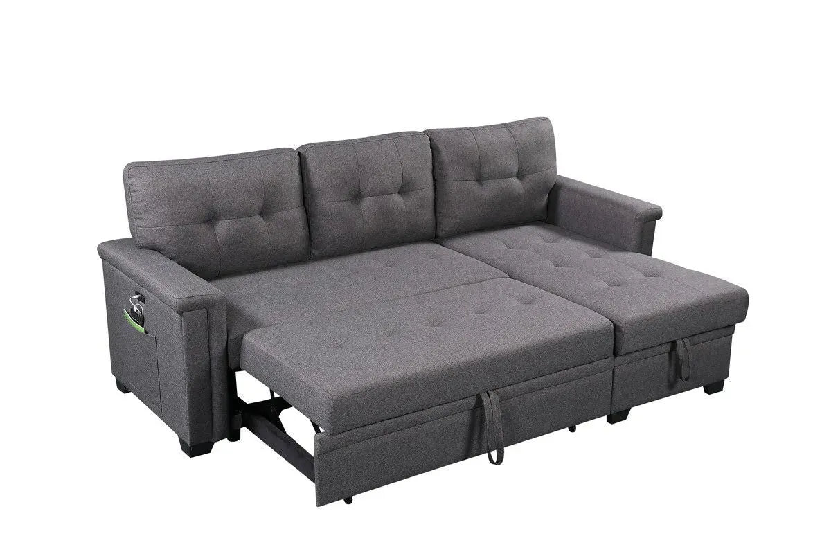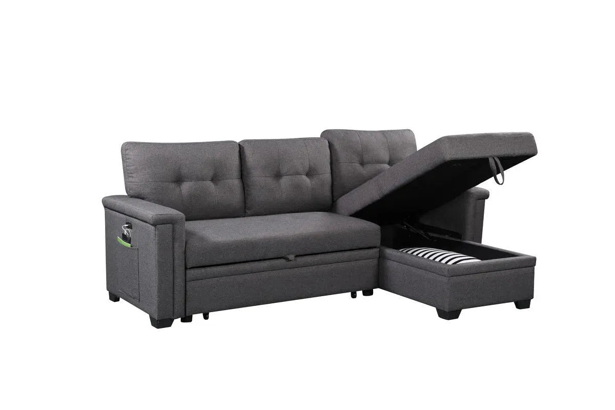 Nathan 84" Dark Gray Reversible Sleeper Sectional Sofa with Storage Chaise, USB Charging Ports and Pocket