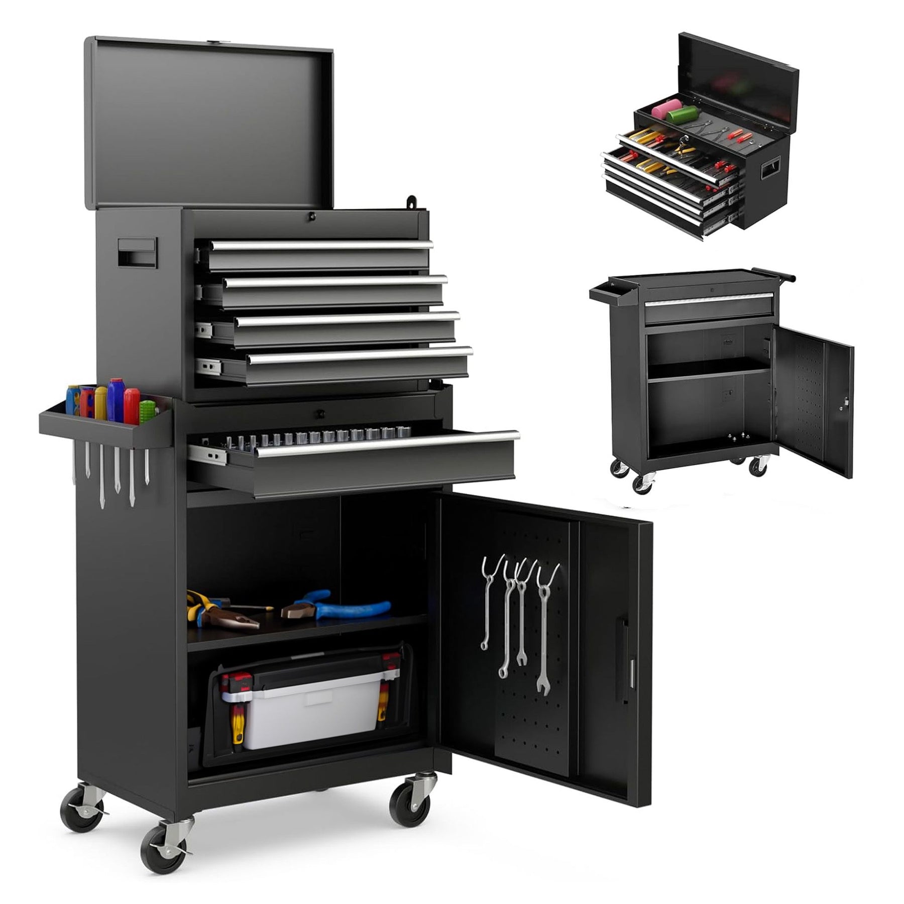 [Easy Moving& Storing] Top box with 2 handles, easy to take and lift, and bottom tool cabinet with hand bars, which help you to move forward. More amazing, the top box can be stored into bottom cabinet, saving your space.Equipped with 4 universal wheels (2 with brakes), the rolling tool chest can be easily moved anywhere, and is fixed in place to increase security. The convenient rod helps you push it more easily.
