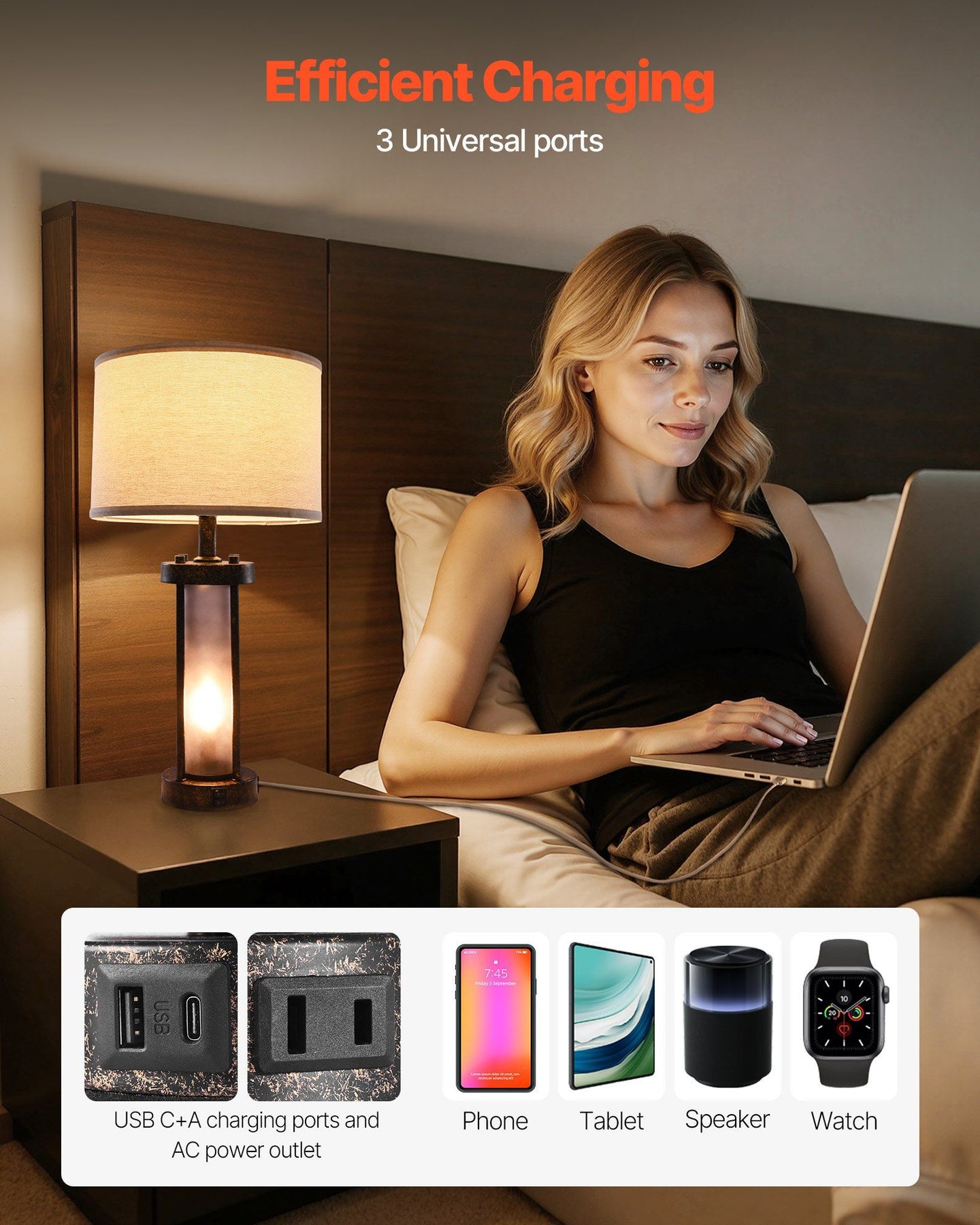 3.Three Charging Ports: Equipped with USB-A, USB-C ports, and an AC outlet, this nightstand lamp can charge up to three devices at once. Ideal for phones, tablets, and laptops, it saves space and improves daily charging efficiency