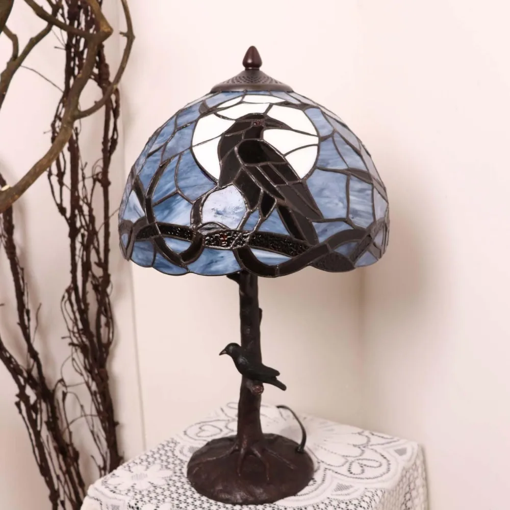 Table Lamps/ L10956 Raven Sitting on Bare Tree Branch in Full Moon Night Tiffany Style Stained Glass Table Lamp for Home Decor