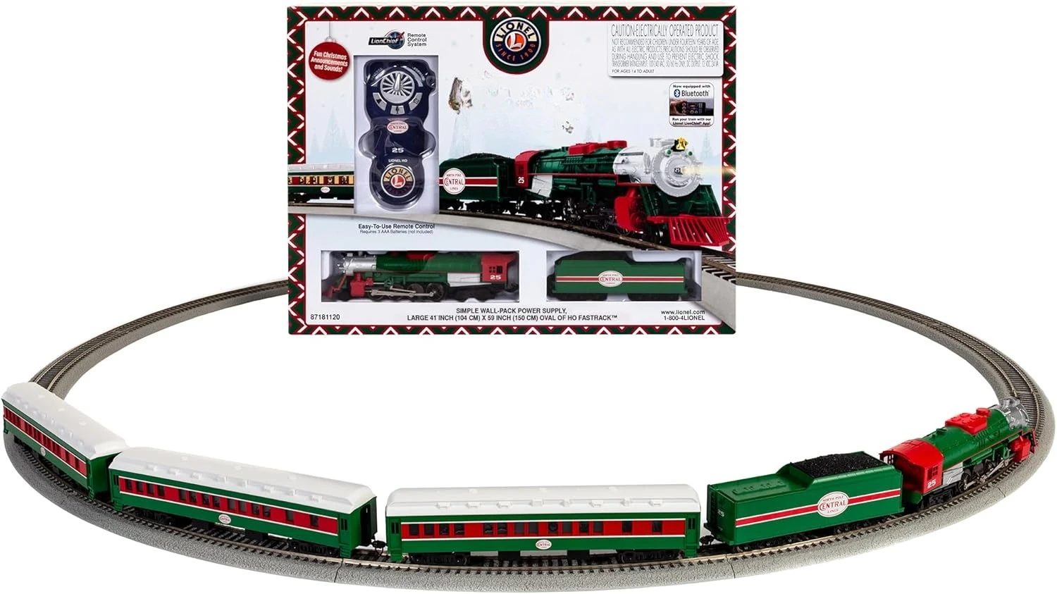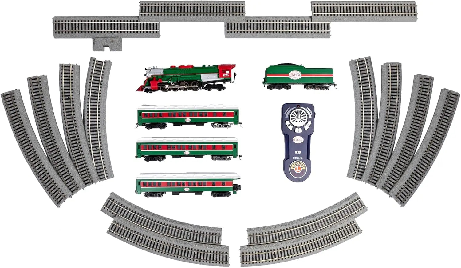 CHRISTMAS EXPRESS HO TRAIN SET includes (1) 2-8-4 Locomotive, (1) Tender, (2) Coach Cars, (1) Observation Car, (12) Twenty Inch Radius HO Curve FasTrack sections, (3) Nine Inch HO Straight FasTrack sections, (1) Nine Inch HO Terminal FasTrack section, (1) Wall-pack Power Supply, and (1) Remote for Locomotive.