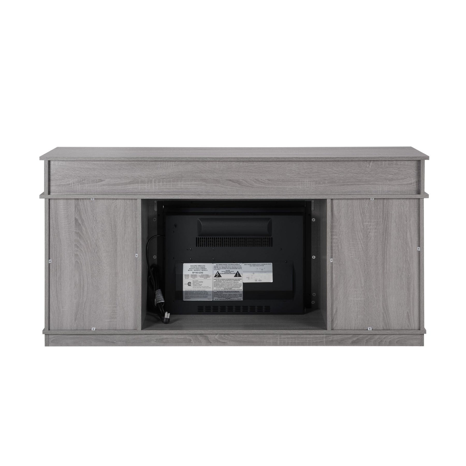 • - Material: Engineered wood with realistic grey wood grain veneer, metal hardware, tempered glass fireplace front