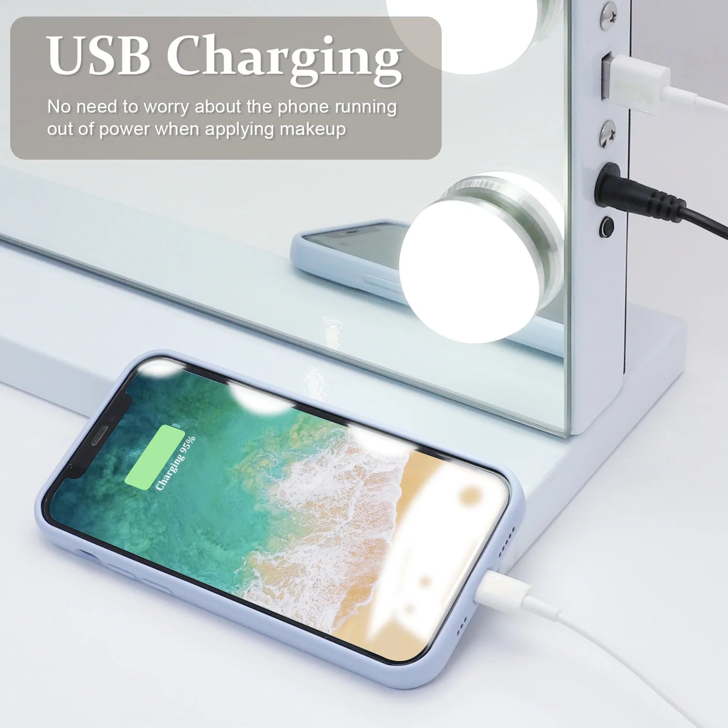 There is a USB charging port so that you can easily charge your phone or other USB devices while making up.