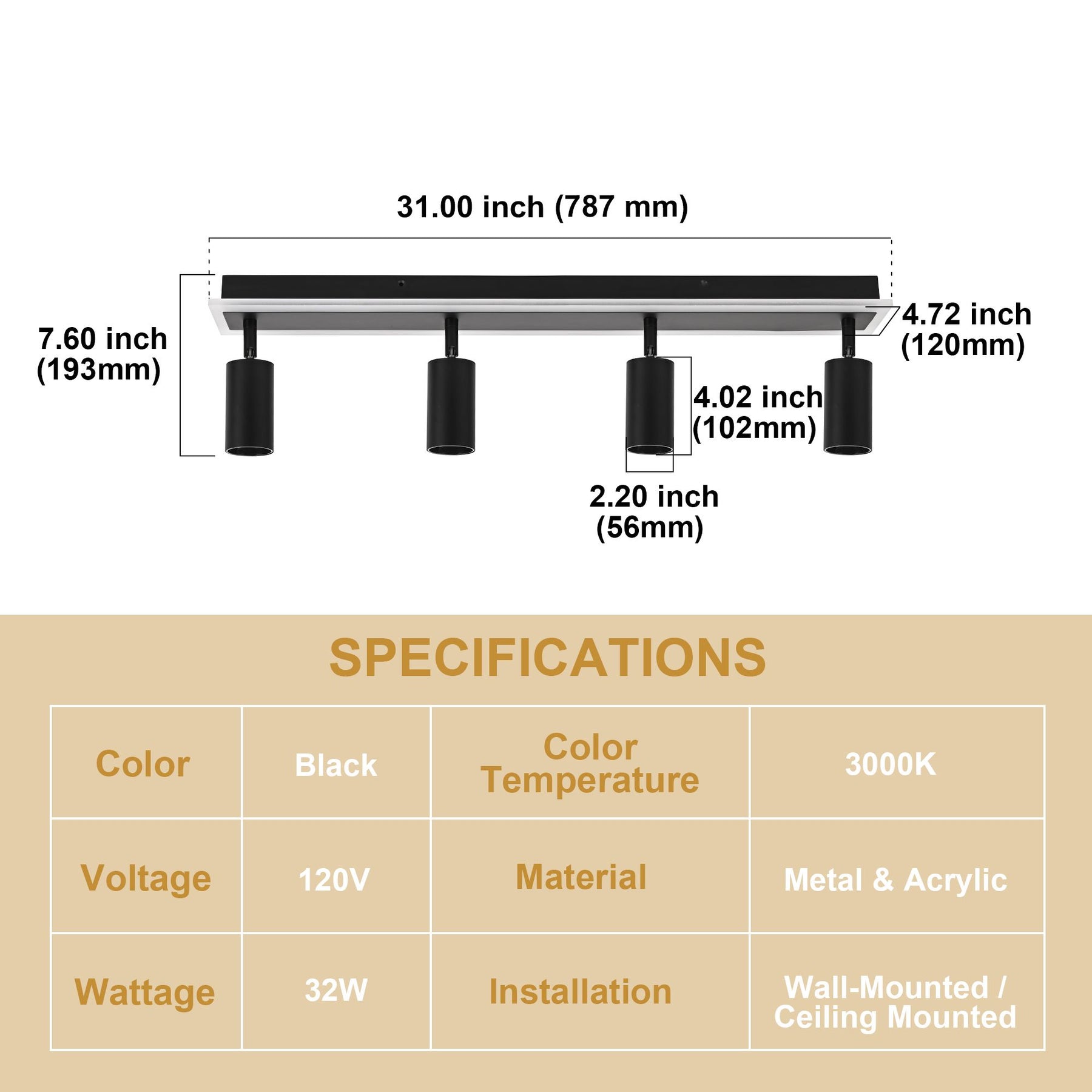• - Fixture Height: ~4–5"