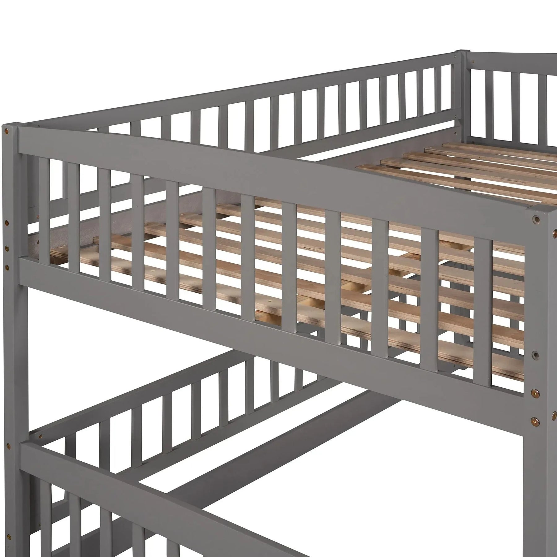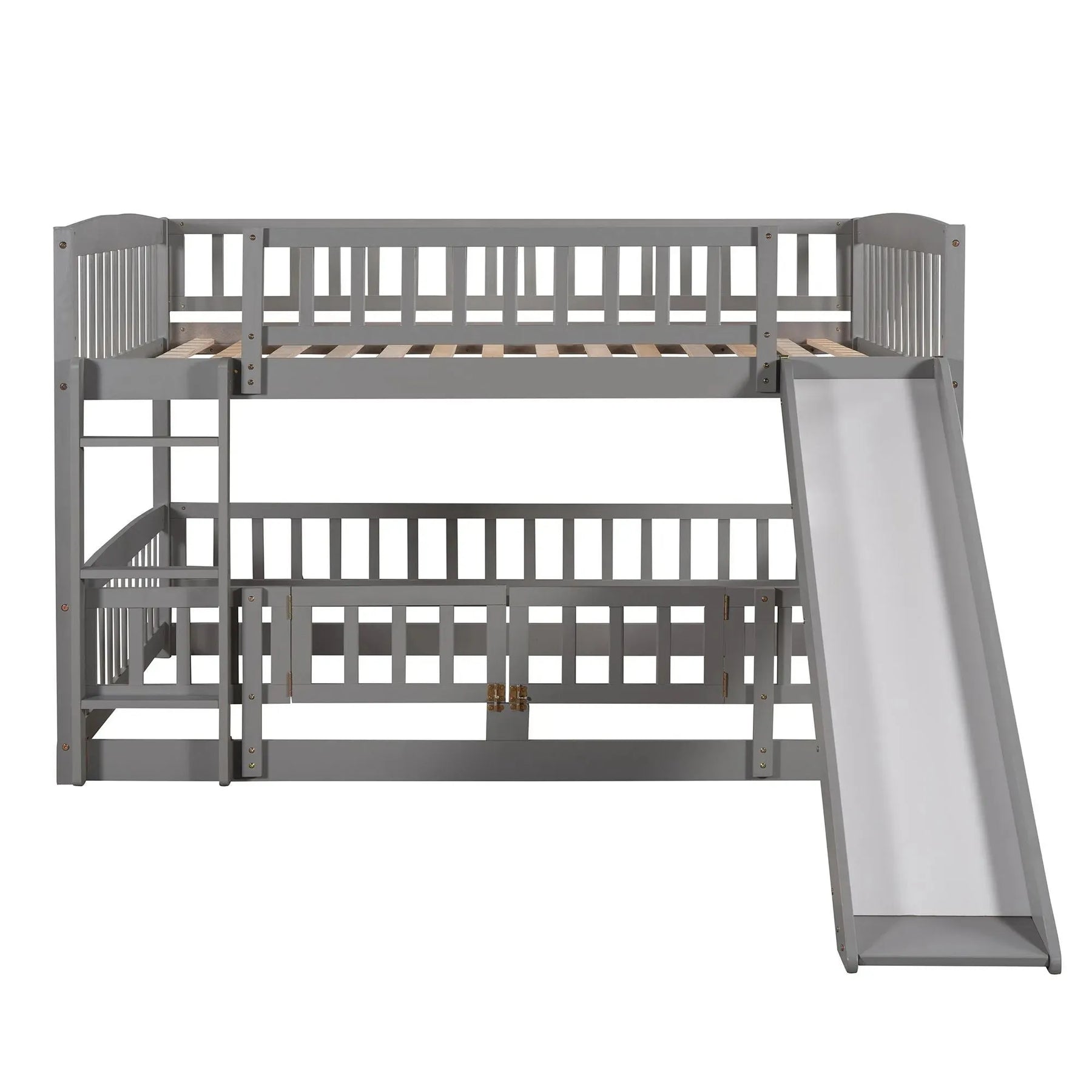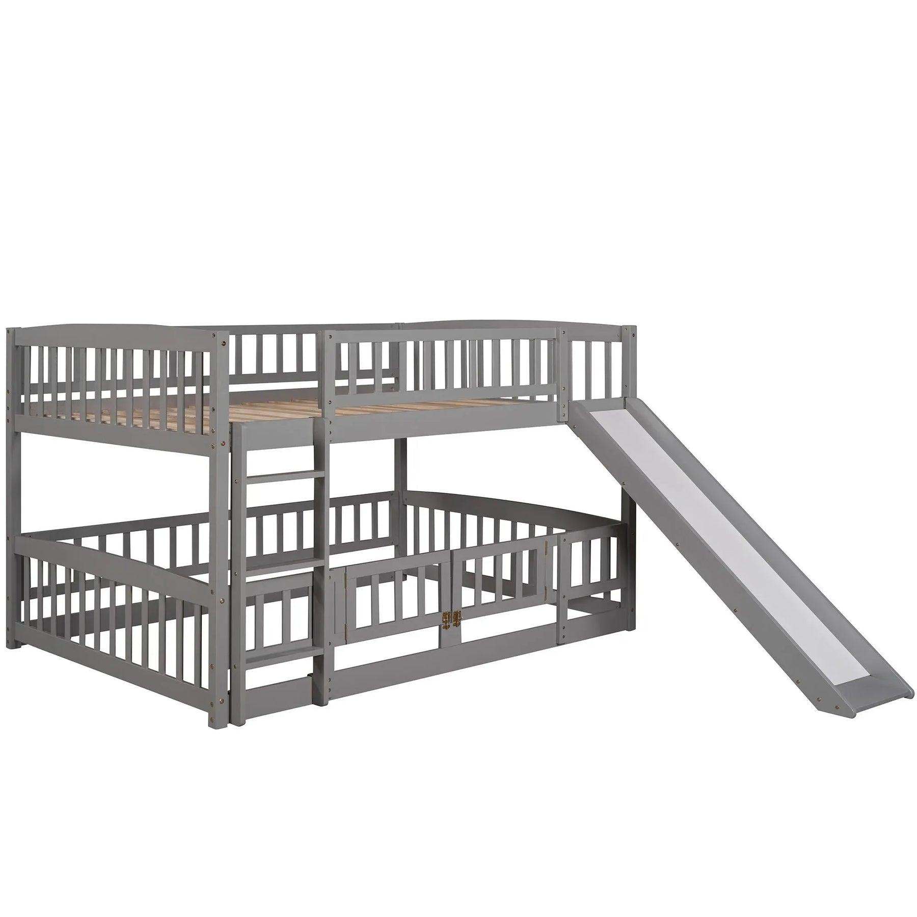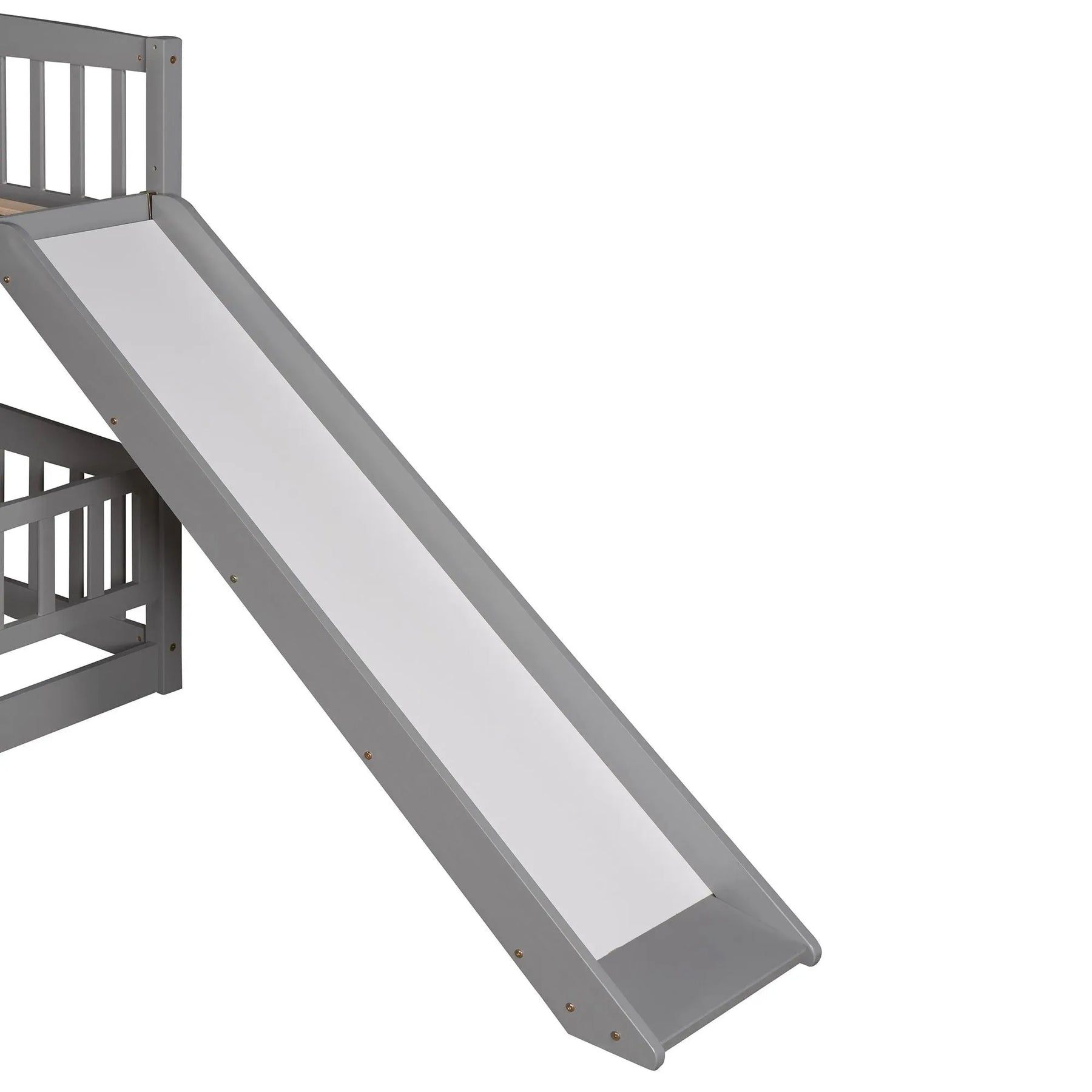 Bunk Bed with Slide,Full Over Full Low Bunk Bed with Fence and Ladder for Toddler Kids Teens Gray
