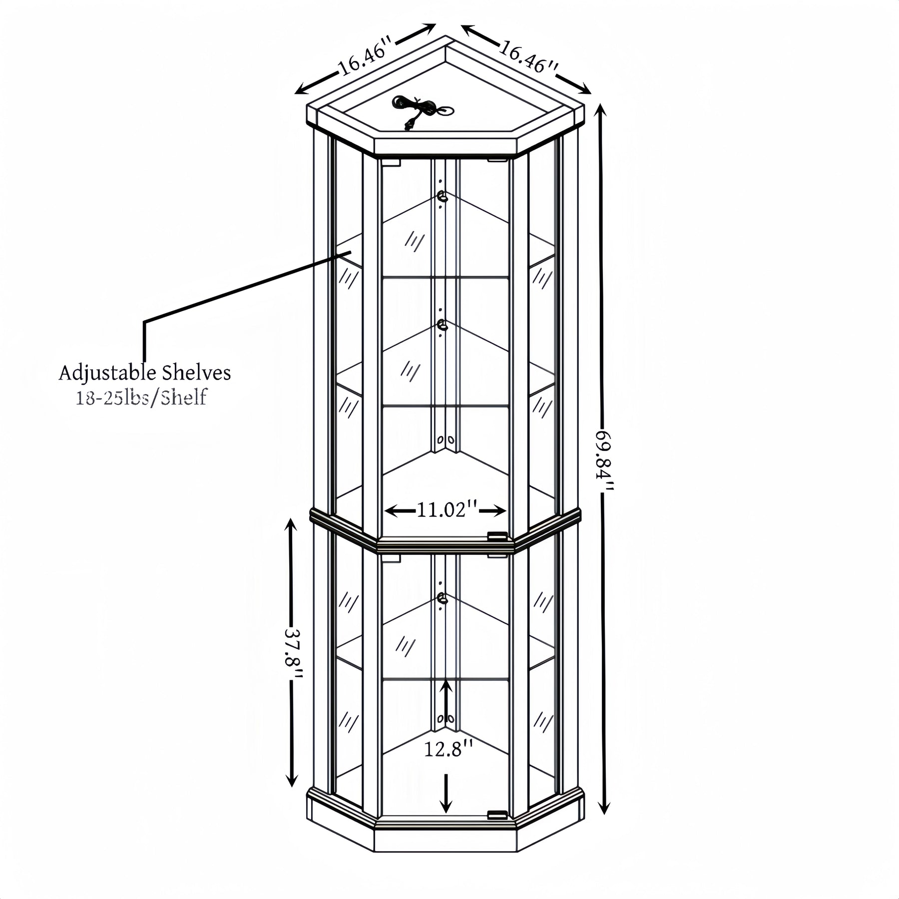 This exquisite glass cabinet storage shelf showcases an impressive overall weight capacity of 150 pounds. Each individual shelf is capable of accommodating up to 25 pounds, while the glass pane doors close securely with the assistance of magnetic door catches.