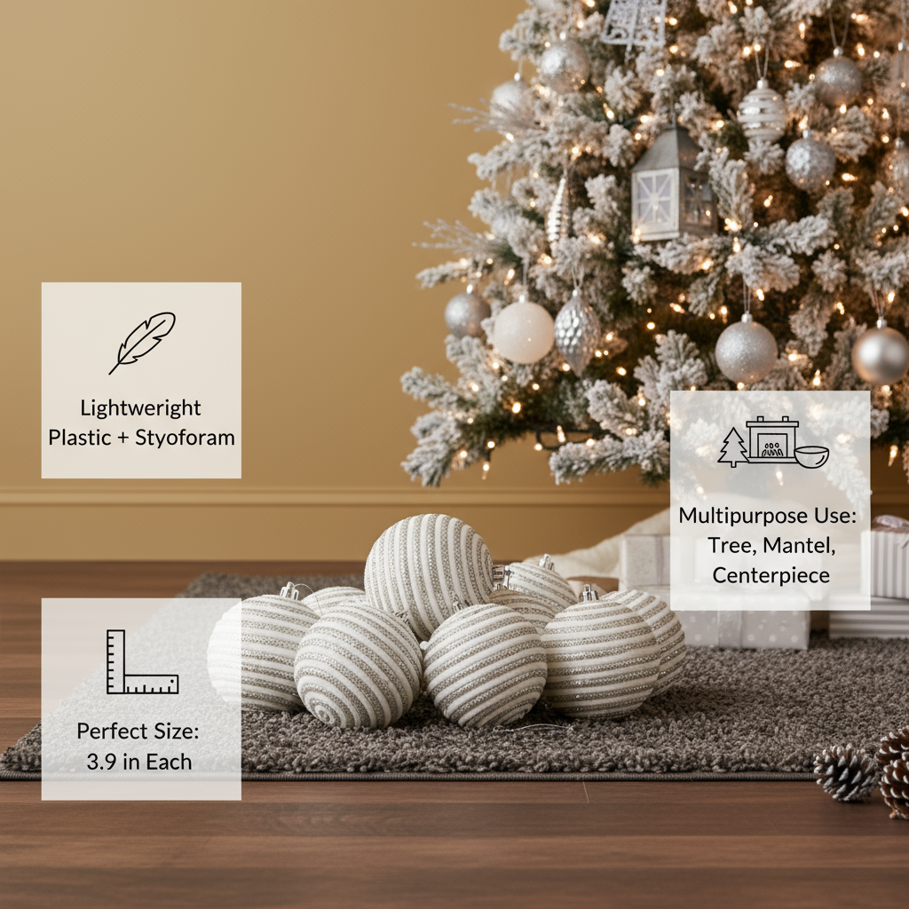 Each ball measures 3.9 inches, the ideal size to catch the sparkle of your holiday lights without overpowering your tree. Their lightweight construction makes decorating effortless while ensuring branches stay balanced and safe. Crafted from premium-grade plastic and styrofoam, they offer the look of delicate glass ornaments with the benefit of shatterproof safety.