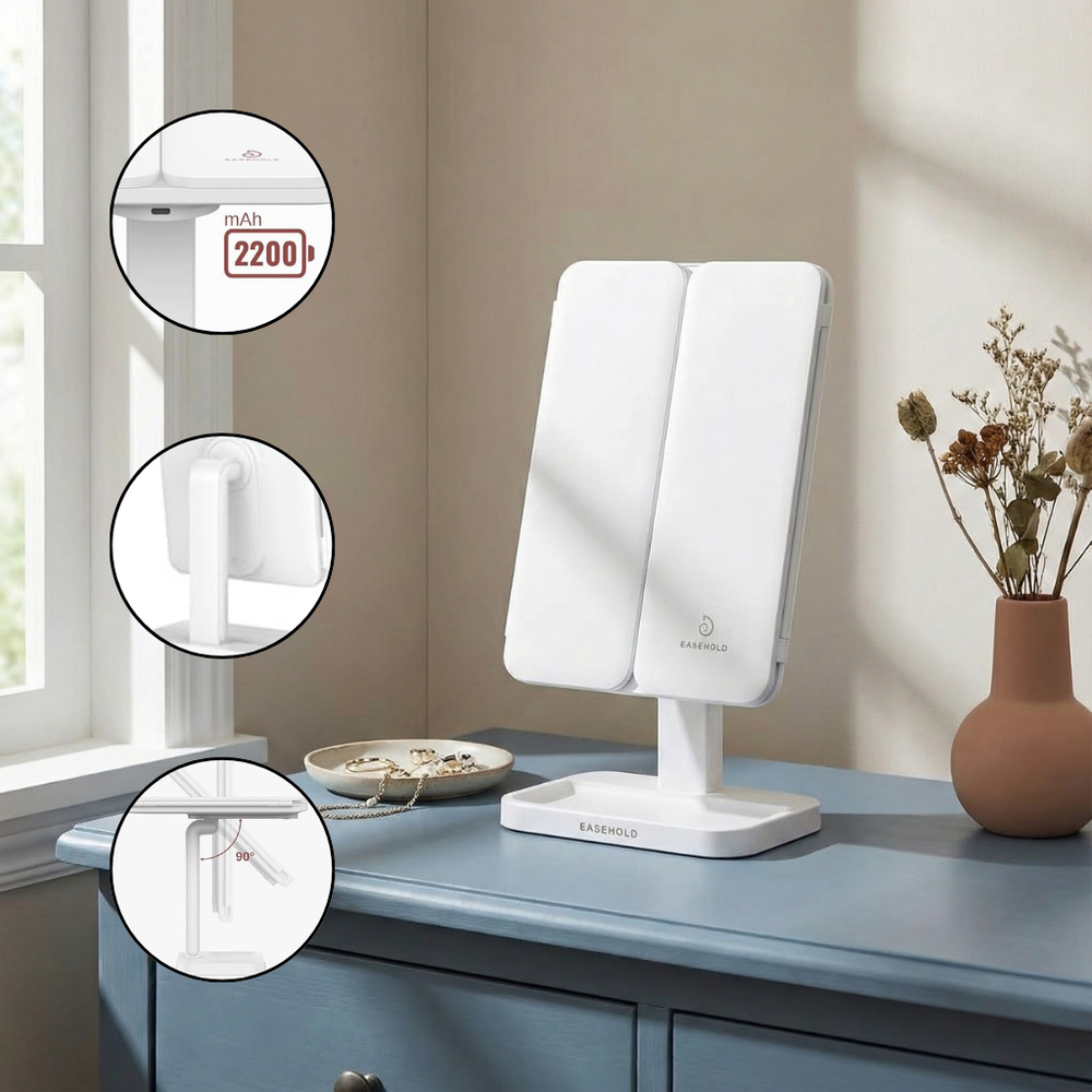 Enjoy the EASEHOLD Tri-Fold Lighted Makeup Mirror with 72 soft LED lights, 1X/2X/3X magnification, rechargeable 2200mAh battery and adjustable lighting modes it's great for home, travel, dorms and making perfect makeup.