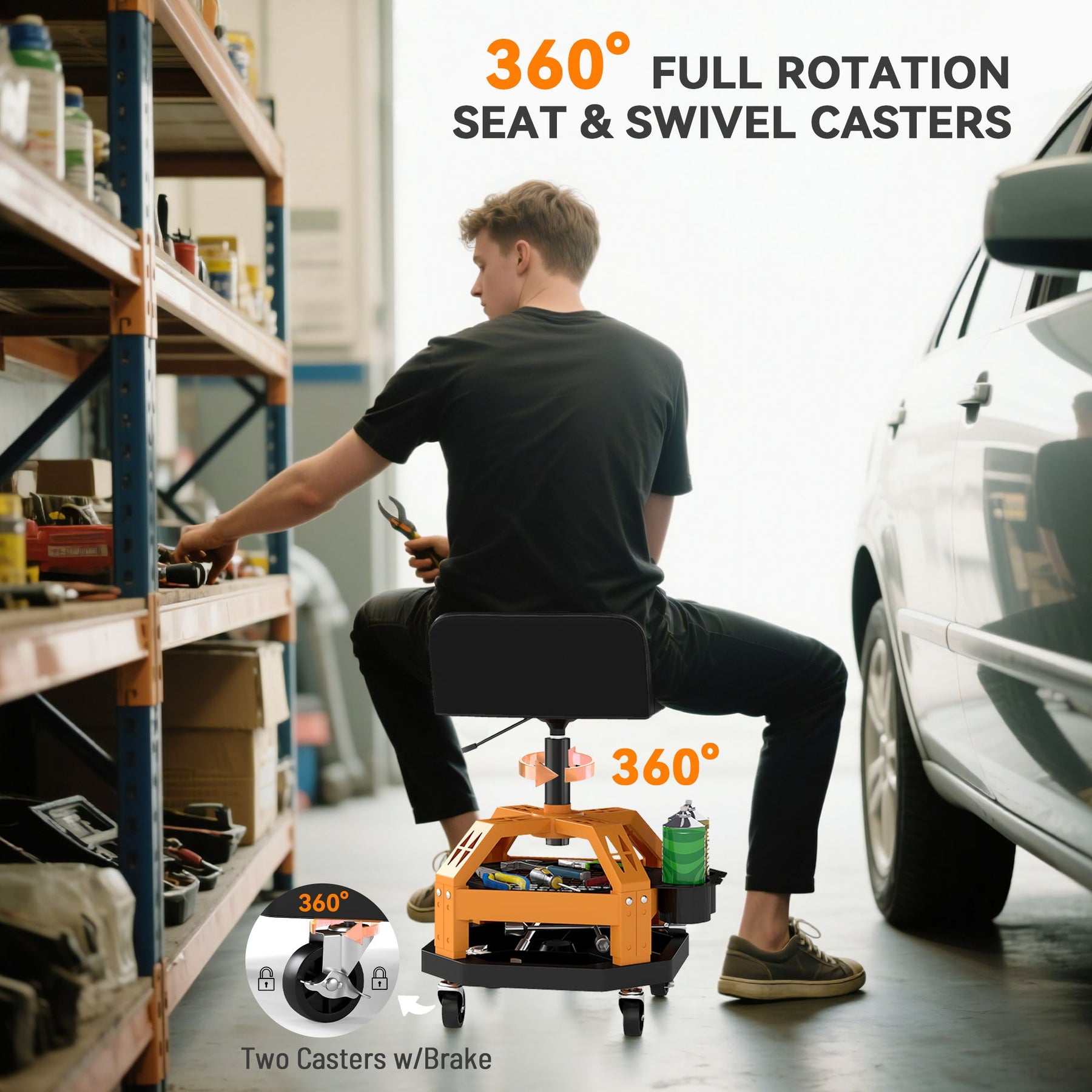 - 360° Smooth Mobility: The mechanic chair features four 3" 360° swivel casters that ensure easy movement in any direction, while two with lock to keep the stool securely in place-stable on all types of flooring