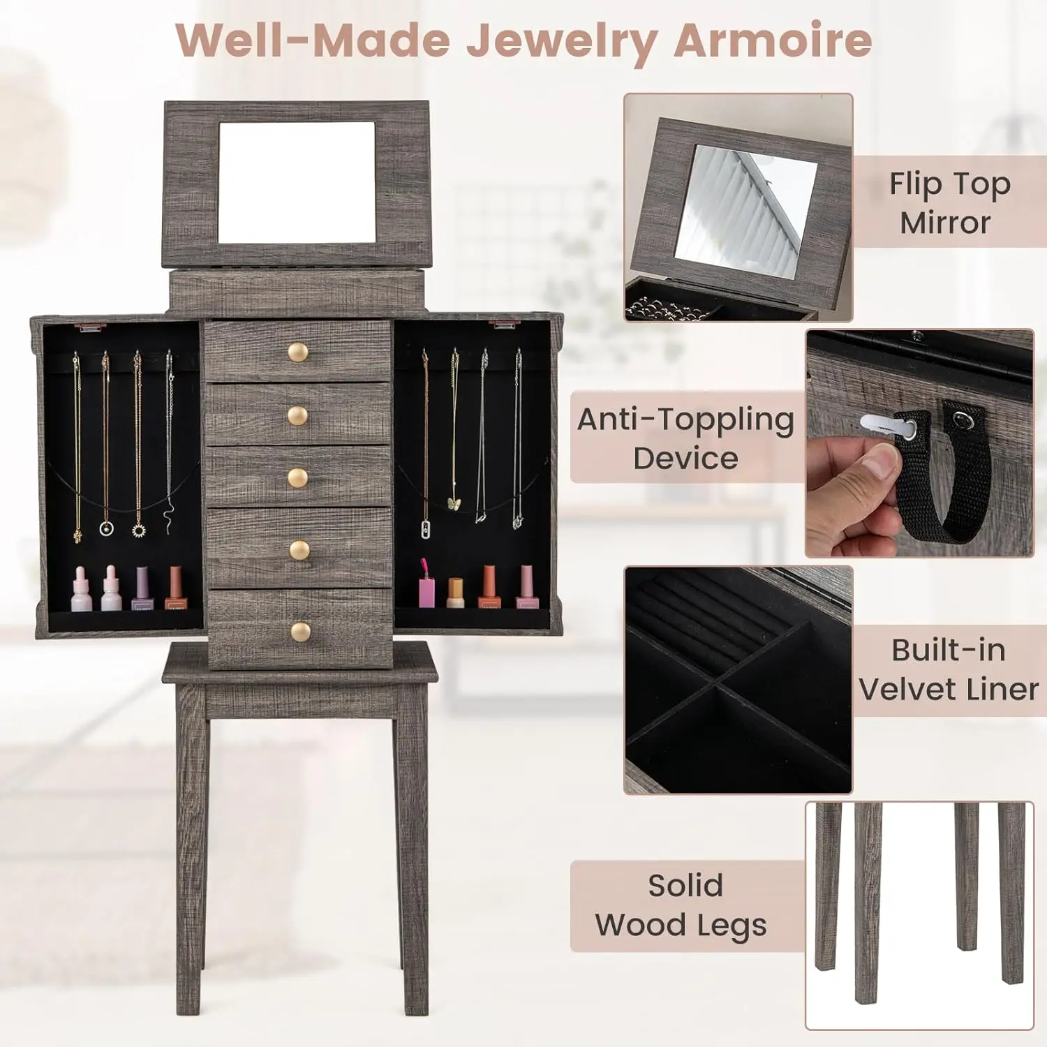 - 【Stable Wood Construction】: This high-quality jewelry organizer is supported by four solid wood legs equipped with anti-slip footpads. Additionally, an anti-toppling device on the back ensures added stability and safety.