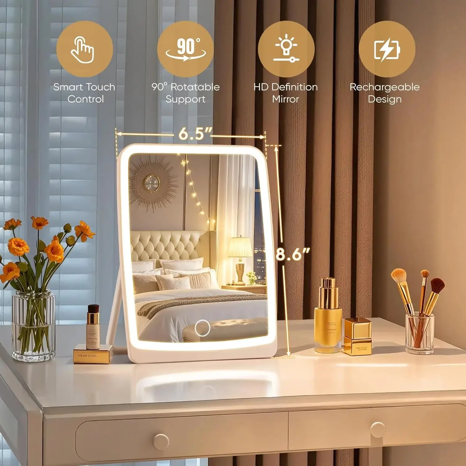 LED Compact Rechargeable Makeup Mirror with 3-Color Lighting, Dimmable Touch Screen, Lighted Travel and Tabletop Cosmetic Mirror