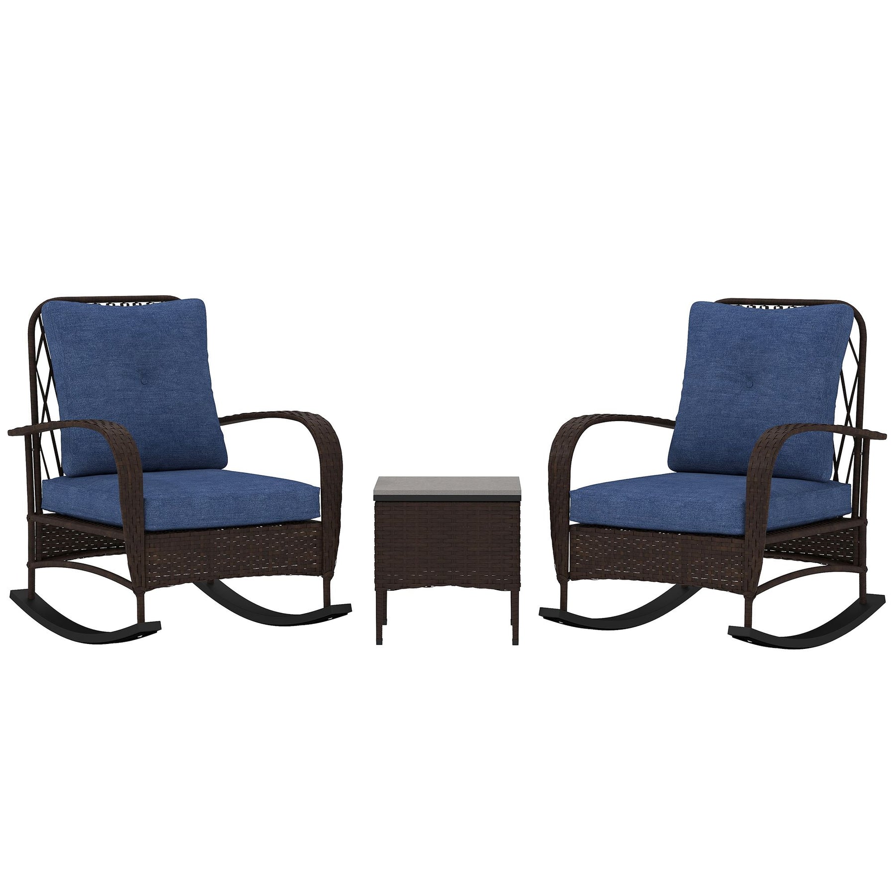 Transform your outdoor space with the Outsunny porch furniture set! This 3-piece wicker patio furniture set includes a square garden table and two rocking chairs, making it great for lounging. The comfortable tufted back cushions, deep seats, and curved armrests, make it excellent for relaxing on any patio, balcony, or porch. Enjoy the gentle rocking motion while you sip your morning coffee or unwind after a long day.