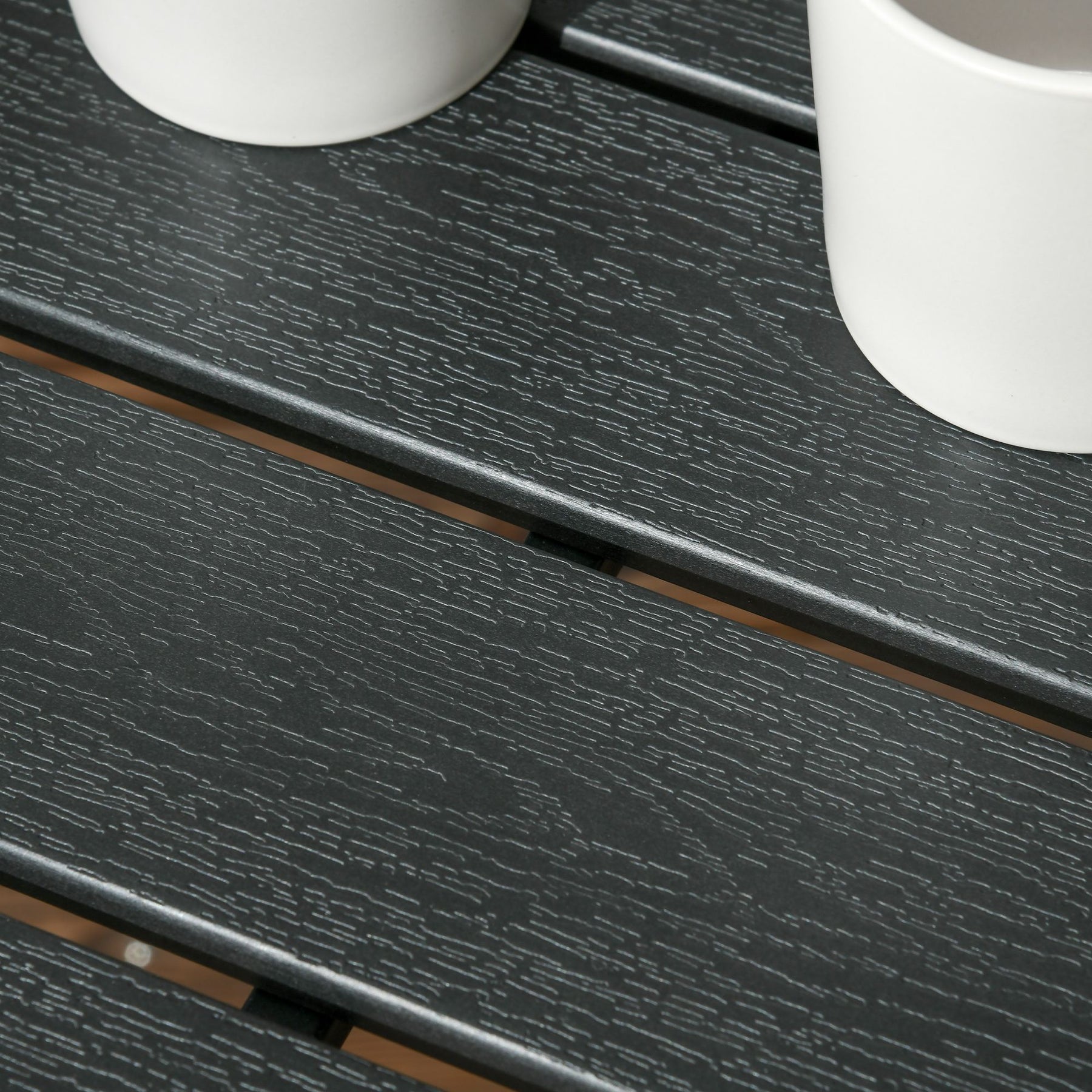 - - Woodgrain dining table with a slatted surface to drain away rain