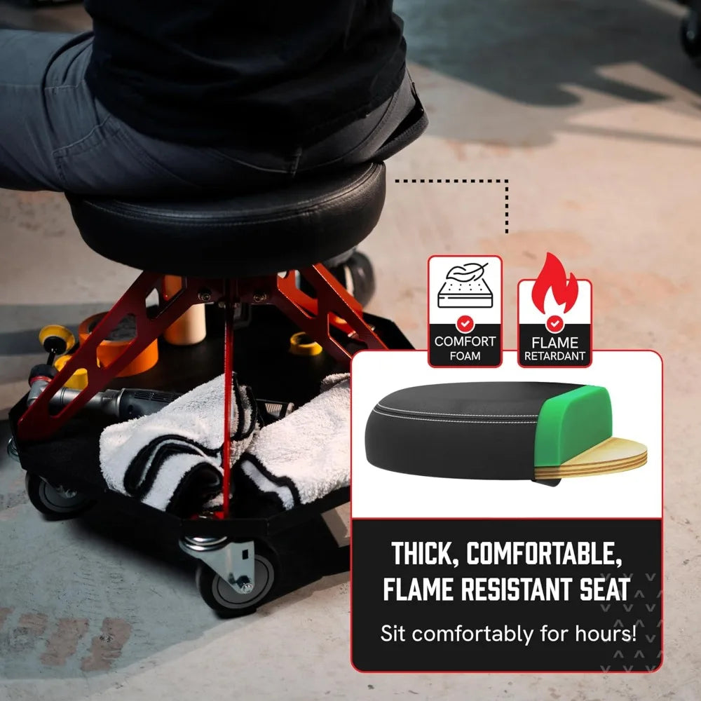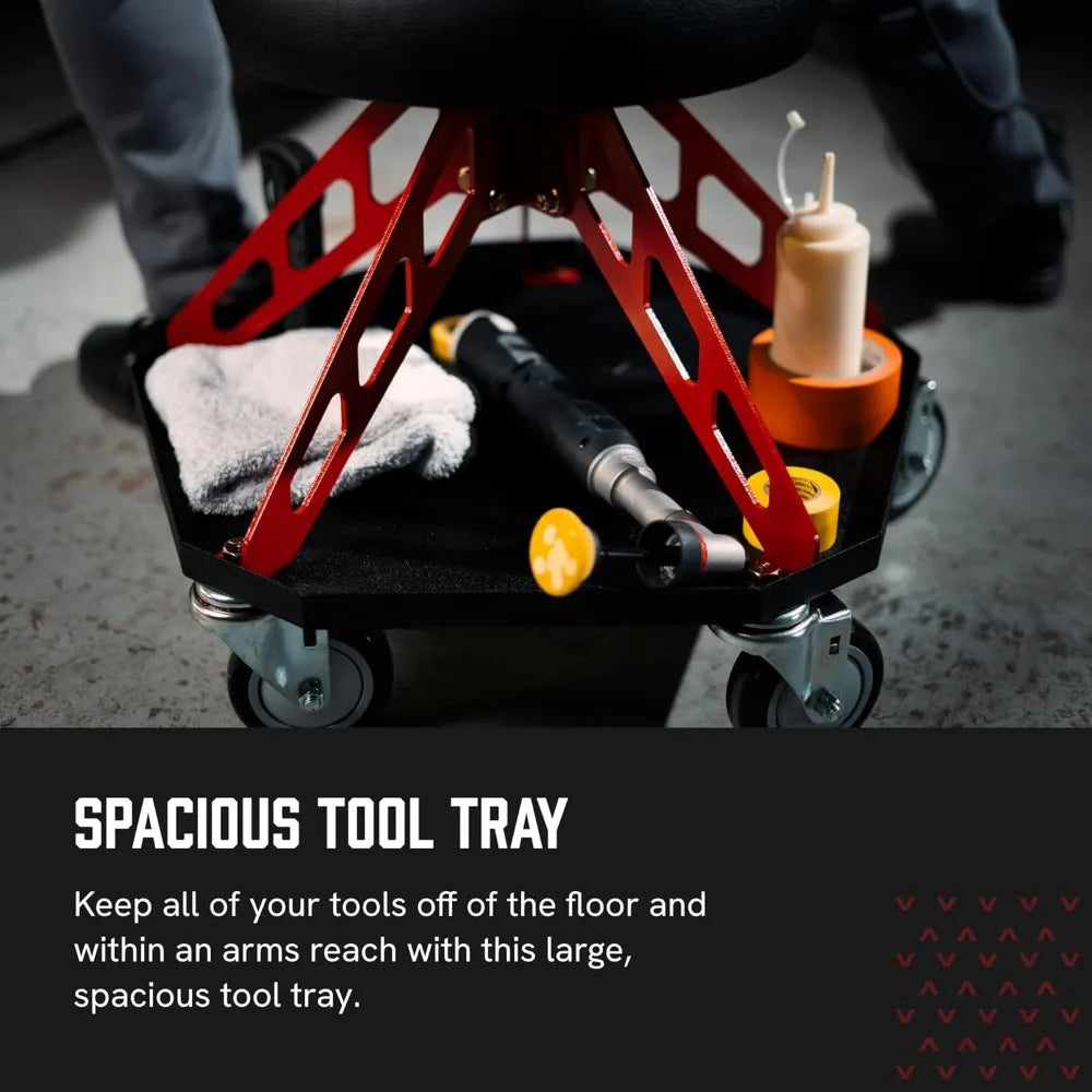 Keep tools within reach – A mechanic chair with built-in, extra-large, stationary tool tray to ensure that tools are always within arm's reach, preventing your things from falling behind as you spin.